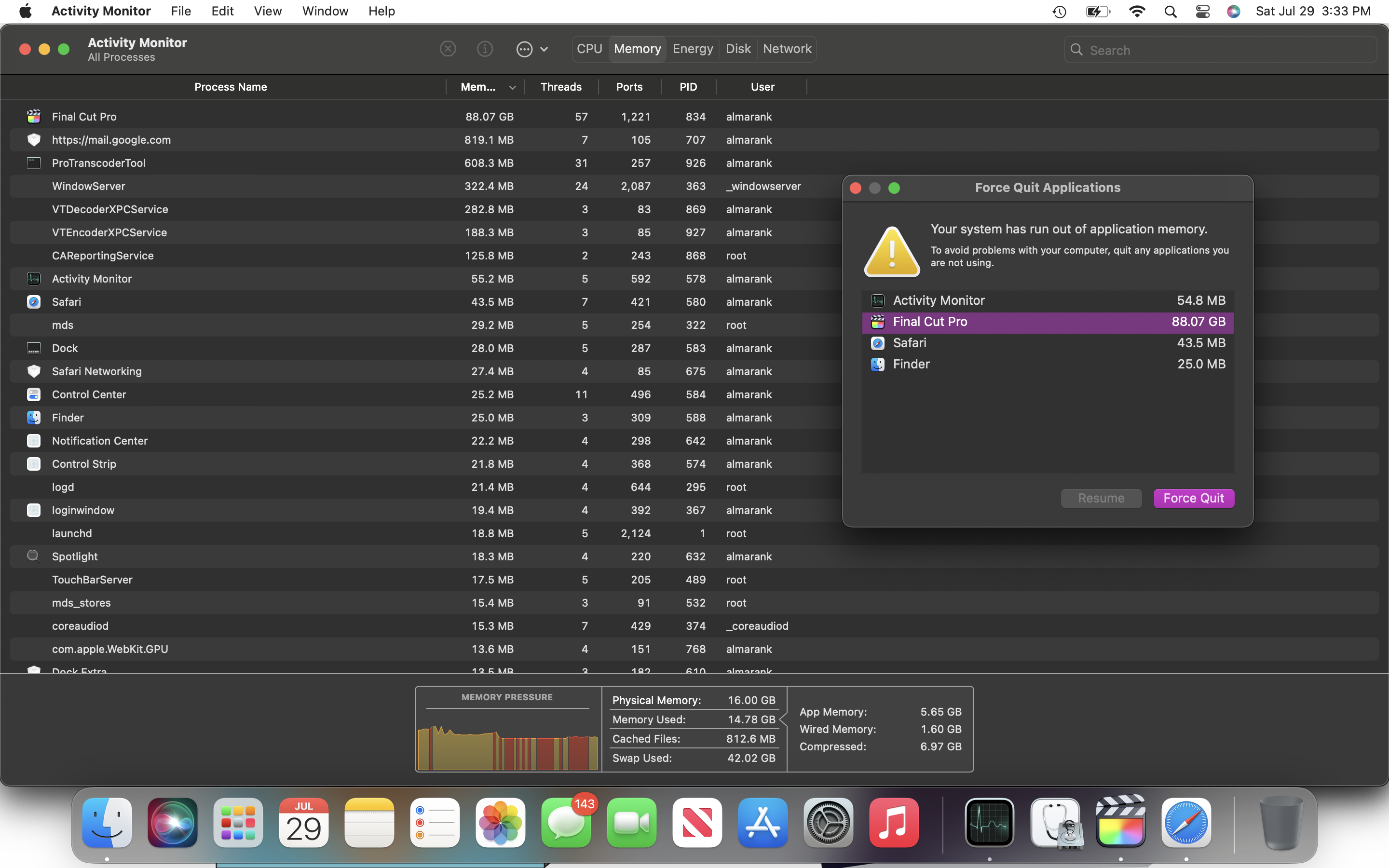Ever since I've updated FCP, I haven't been able to export my video. I make YouTube videos weekly and have been getting into more effects. I thought that the effects or compound clips were the issue, but removing them from my video made no difference in the exponential amount of RAM that it is being taken up. When I export to 4k (which is what I always export in) it climbs to over 80 GBs of memory in my Activity Monitor. I am currently using a 2020 MacBook Pro with 500 GB of storage and 16 GBs of RAM. I have all the updates; I have restarted my MacBook and deleted the app many of times. I've heard others have been having issues with this current update. Even when I'm not heavily editing (just simply watching a video before I export) FCP uses up 40-50 GBs. A lot of the time the Memory Used in the Activity Monitor doesn't surpass the Physical Memory, and the app still crashes. I am no longer able to export longer projects. I tried splitting it in half as a last resort, and it didn't even get halfway through before crashing again.