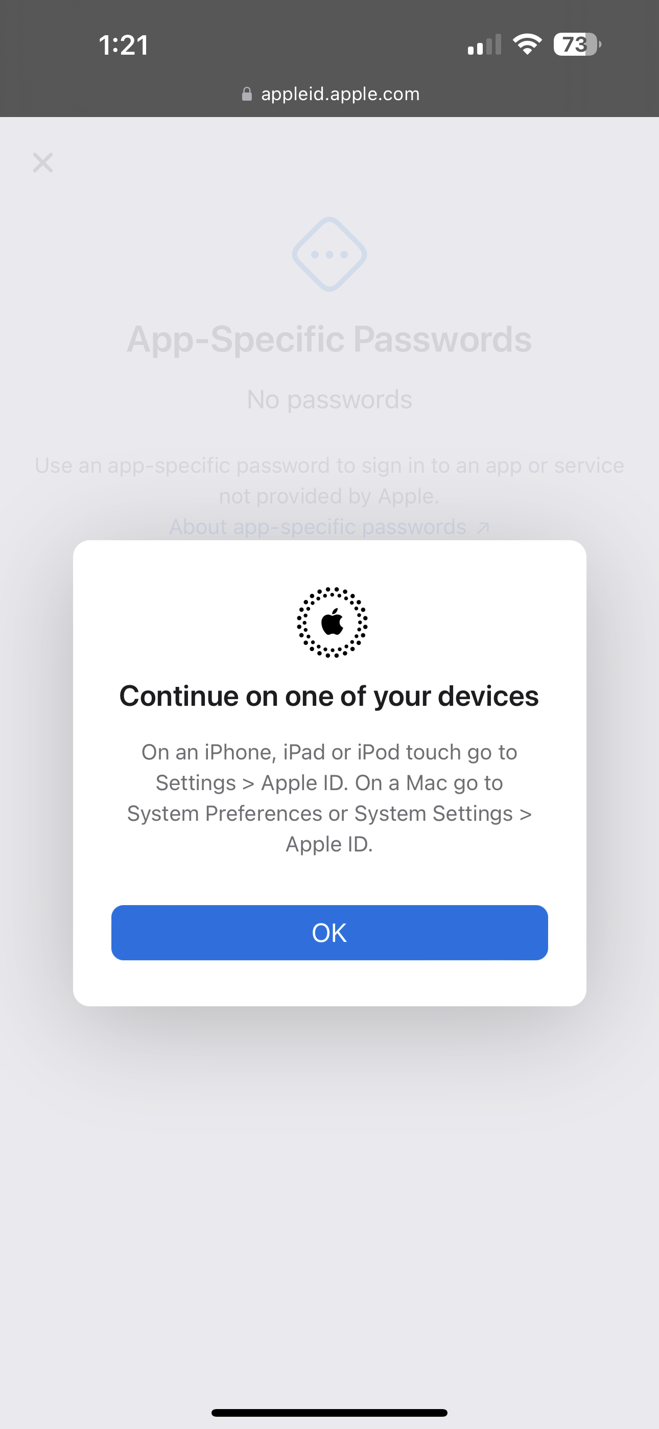 Unable to generate app specific password for Alexa. Have 2 factor on and went to appleid.Apple.com. Entered name on label then it tells me to continue on iPhone and then I am stuck. HELP!