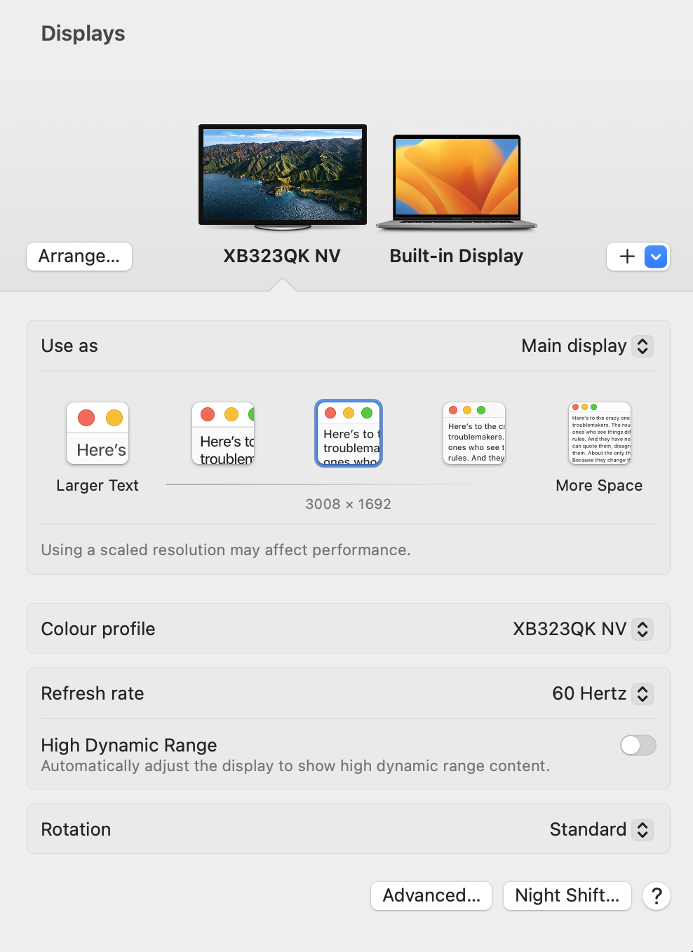 I recently bought a new monitor (Acer Predator XB323QK) which has USB-C Power Delivery for using with my 2019 Macbook Pro 16". Im using an Apple Thunderbolt 3 Cable between the 2 devices. When first booting up and trying it out, it worked great and showed the monitor in full resolution as it should. I chose the middle option when choosing the scaling which stated that it would slow performance but i didn't mind.