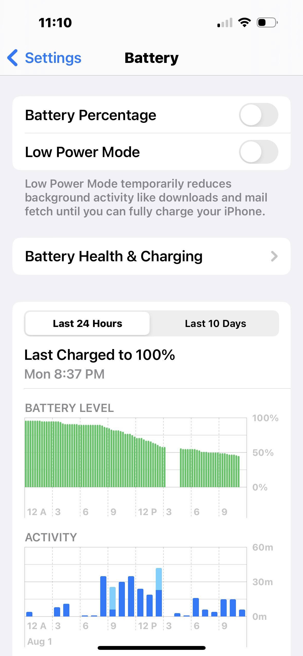 I’ve had on three occasions where my battery level appears with no lines of color as if it were dead, but my battery is charged as you can see. Yesterday i happen to look at the graph and noticed the same, but I was not on my phone during this time frame. We were at a Best Buy store I do have the latest iOS installed.