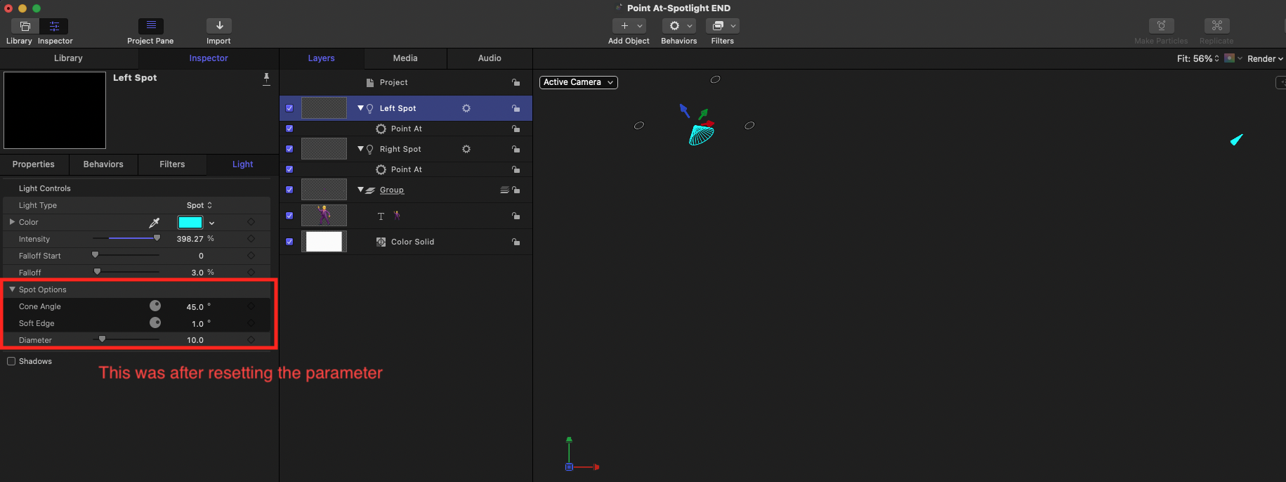 You reset the Spot Options and I recommended resetting the Properties > Transform > Rotation parameter(s), although the 45º Cone Angle will help out immensely!