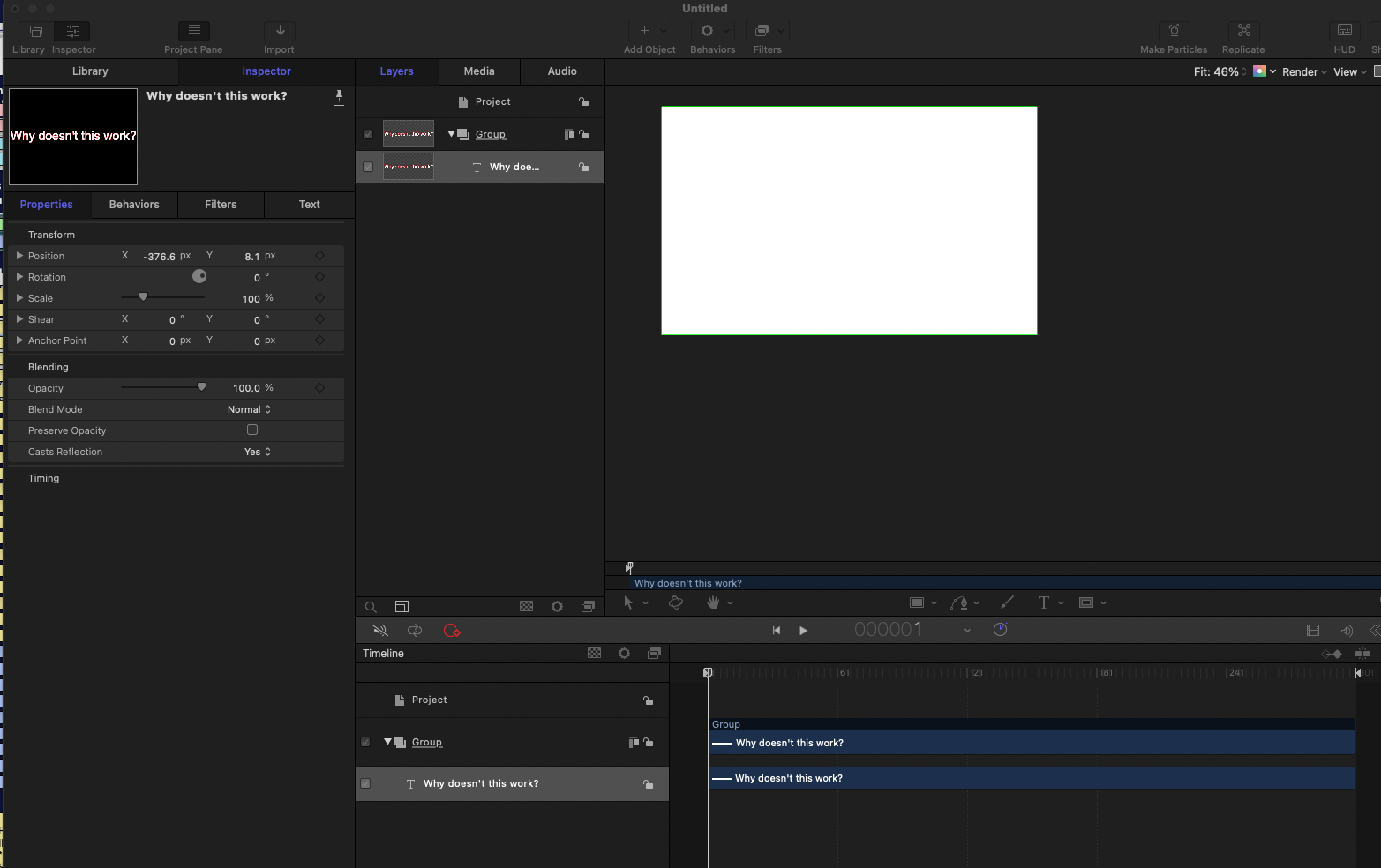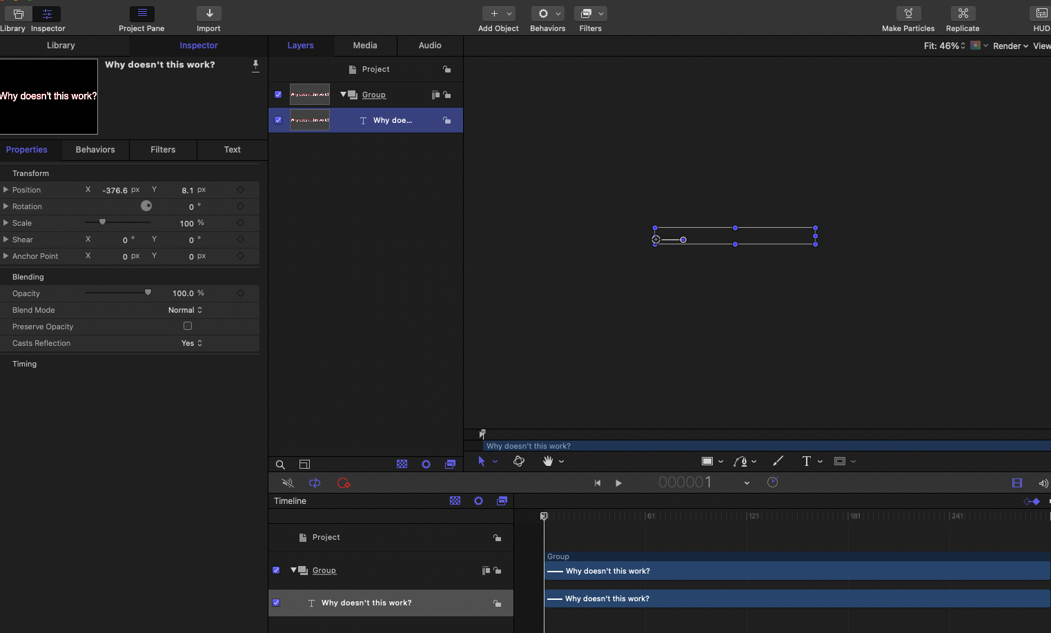 I started a brand new project. And I entered in some text. As you can see, it shows the text in the top of the Inspector window. It shows the text I wrote in the Layers panel. It shows the text I wrote in the Timeline. It shows the bounding box in the Canvas, but the text cannot be seen.