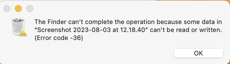 iMac 3 GHz 6-Core Intel Core i5running latest OS, 3.4.1 (c) - When trying to delete files from the desktop the following appears on a regular basis. "The finder can't complete the operation because some data in <file> can't be read or written." When I restart the computer it's fine again until the next time. We have three users running their own partition.