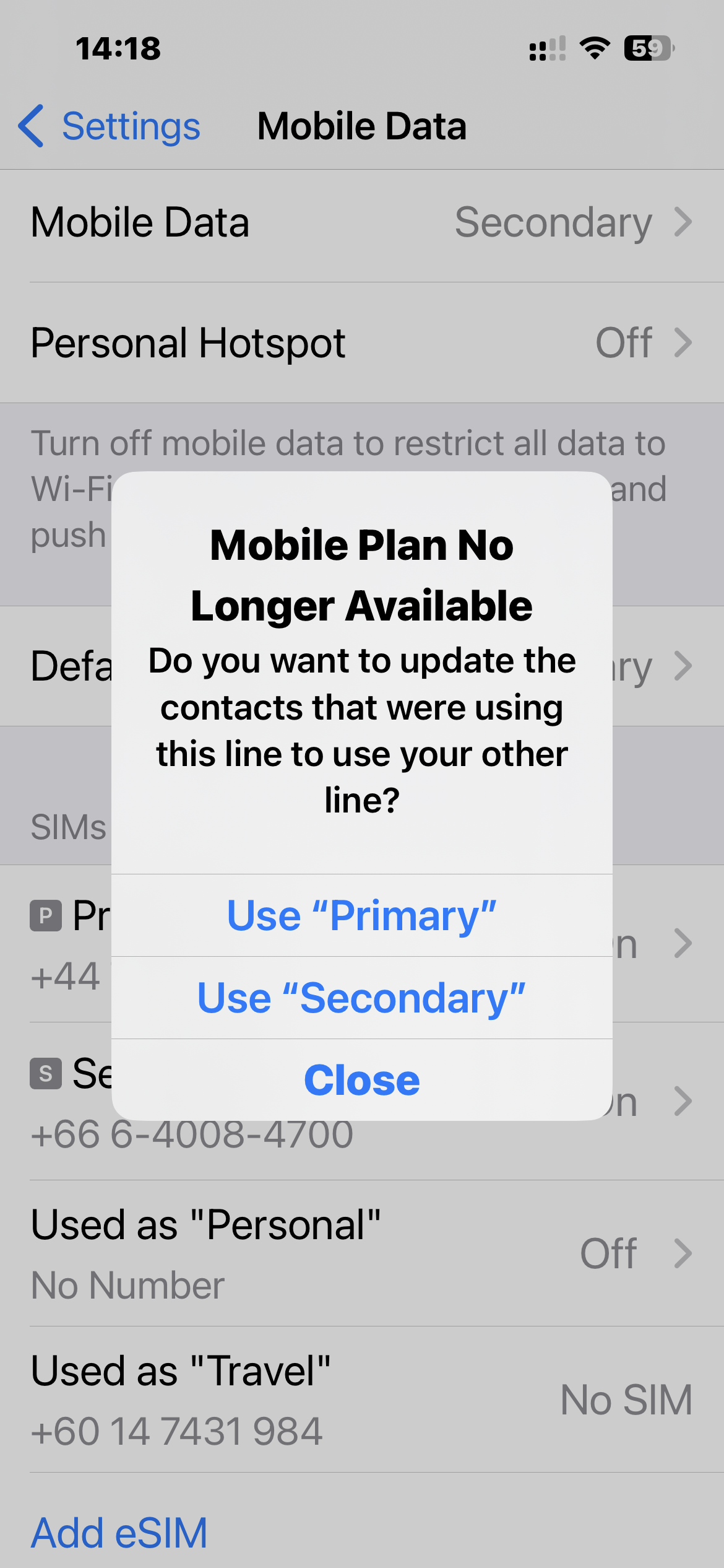 Hi, I took out an esim on travel to another country. It was a 30 day plan which has now expired. I still have reference to the esim on my iphone but I am unable to delete it because it says "mobile plan no longer available" and will not open a screen for that esim. So how do I get rid of this esim please?