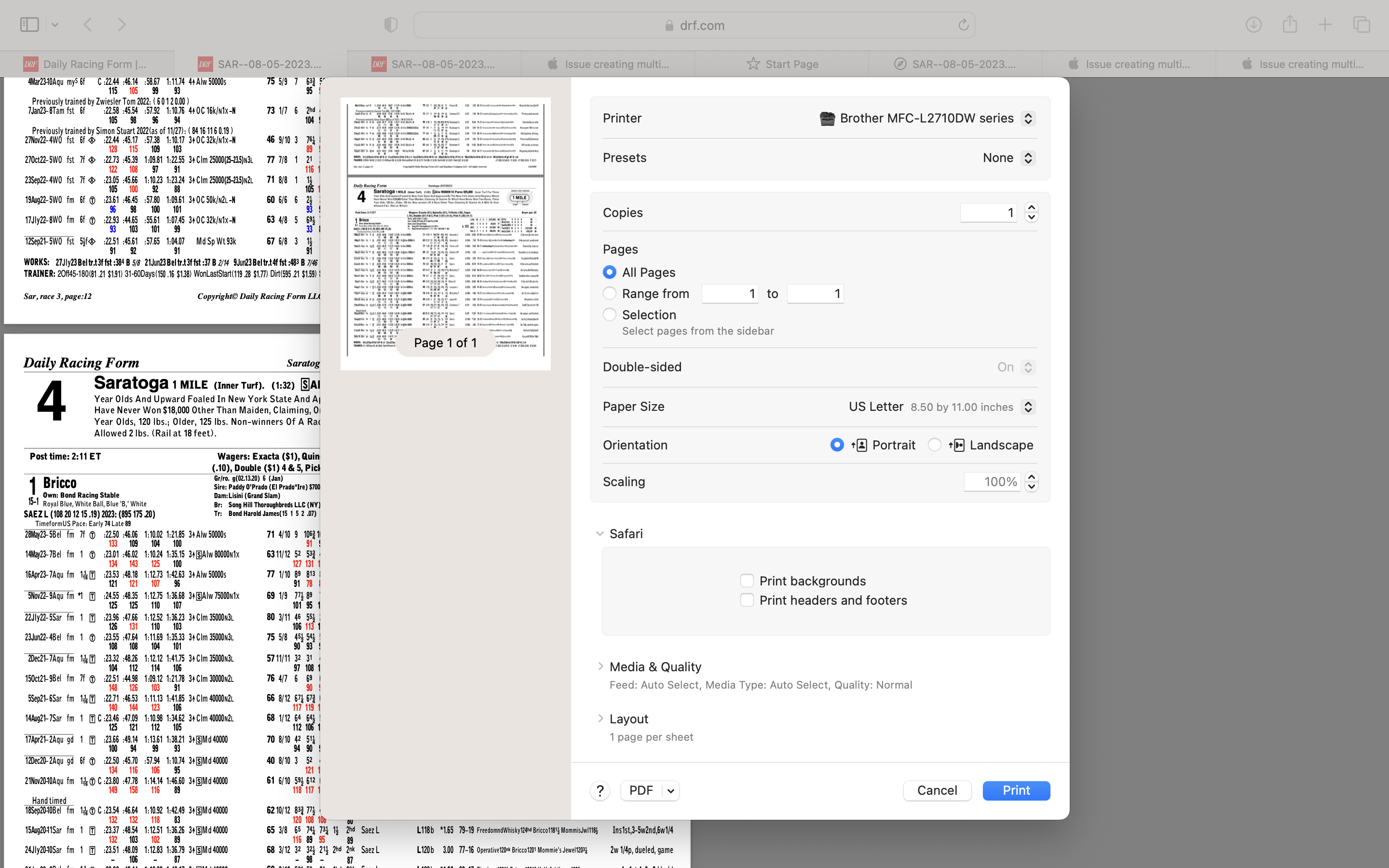 The website I visit (Daily Racing Form) prepares multi-page PDF documents, and prepares them for printing. The website has a Print-Menu, and the document becomes a Multi-Page PDF, however when I try to print to PDF from Safari File Menu, or Save the document, only the first-page of the multi-page document gets saved or printed to PDF. I can read the multi-page document on my computer screen.