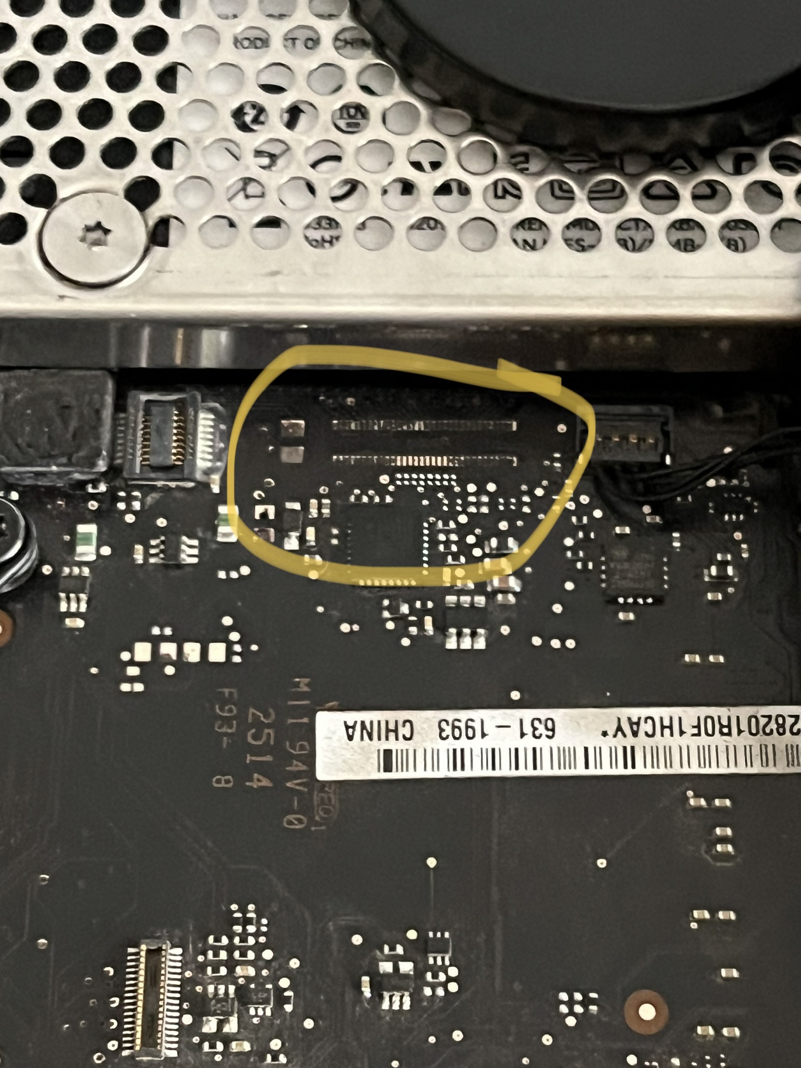 Small update, not a good one but this Mac is weird. So I have unplugged the SSD from the Mac and tried booting and fan goes to a high speed not max speed but high speed but no image on display then when it’s about to show a display it turns off. I was also watching a video on an ssd replacement and noticed that there was something missing on my motherboard than the one showed in the video the screen shot and picture will be put on this reply but I don’t know what it is for. Thanks