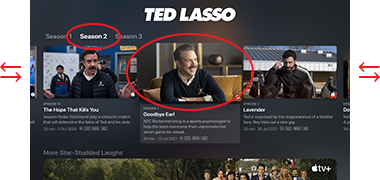 What happens when you find Ted Lasso anywhere else but Up Next? That should load the Details page for that show. Scroll down to see all episodes from all seasons in one row. In the episodes row, go left or right to navigate to other episodes. Select an episode tile preview image to start that episode. There is also a Season selector directly above the episodes row, to jump fast to episode 1 of each season.
