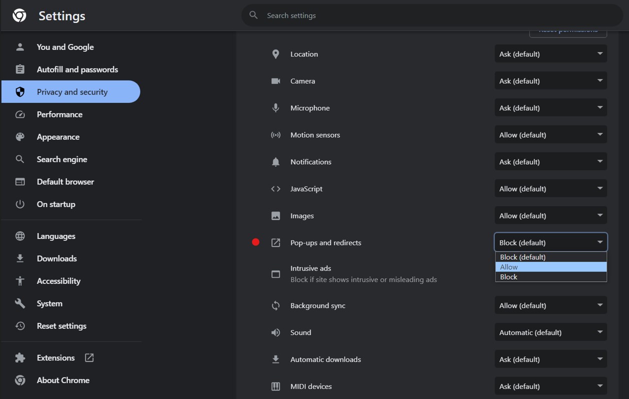 and then change the settings for 'Pop-ups and redirects' from 'Block' to 'Allow' (picture 2)