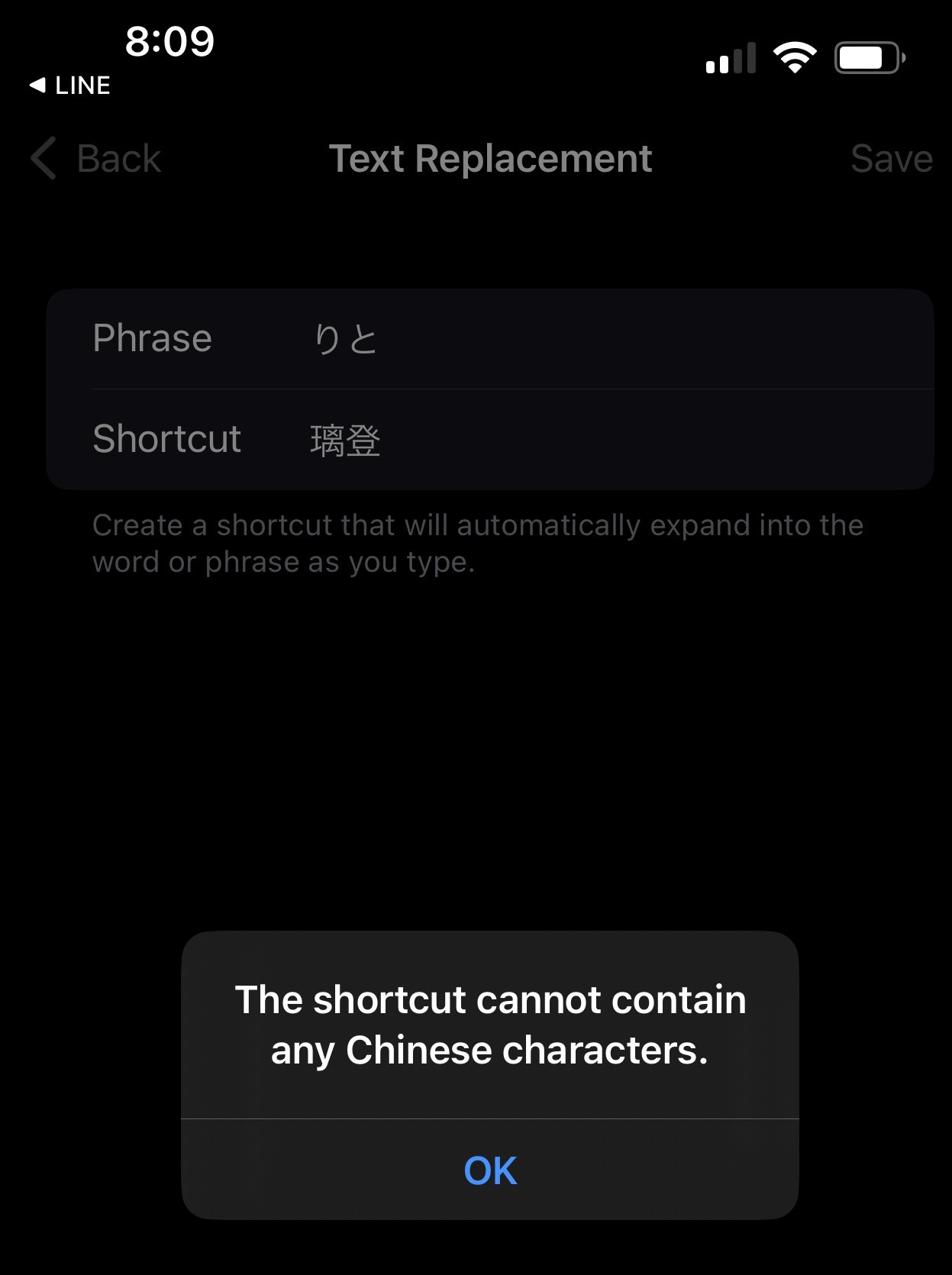 I have referred this apple support web page to create a text replacement for word and input pairs. I followed it but my phone (iPhone 14 Plus) showed error message: 'The shortcut cannot contain any Chinese', however I was using Japanese Keyboard.