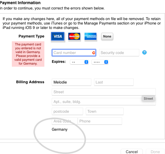 I have moved country and my credit card does not match the address provided in the past. I can change everything in the address except the COUNTRY. therefore it keeps telling me that the credit crad provided does not match any credit card in Germany because it obviously doesn't...How can I change the country?