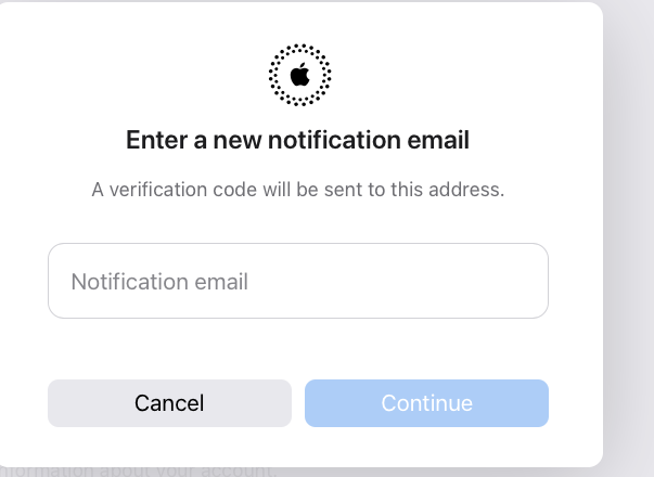 You have to click on change mail , type a new notification mail address ( say created with gmail services https://support.google.com/mail/answer/56256?hl=en ) a code will appear on that account , you have to open that web account , use the code and enter in upcoming steps from Mac , click on continue and save .