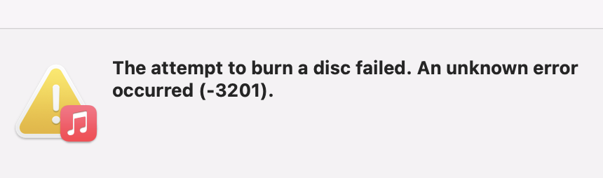 "The attempt to burn a disc failed. An unknown error occurred (-3201). I've tried different CDs. I've closed out Music and rebooted. Any suggestions? Thanks