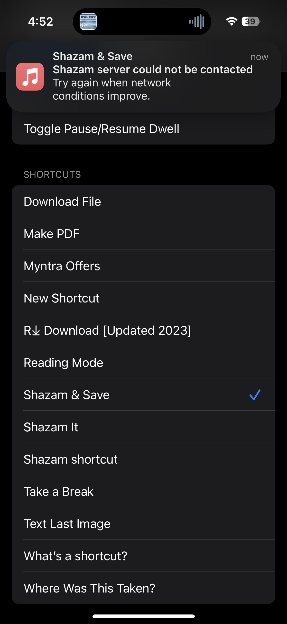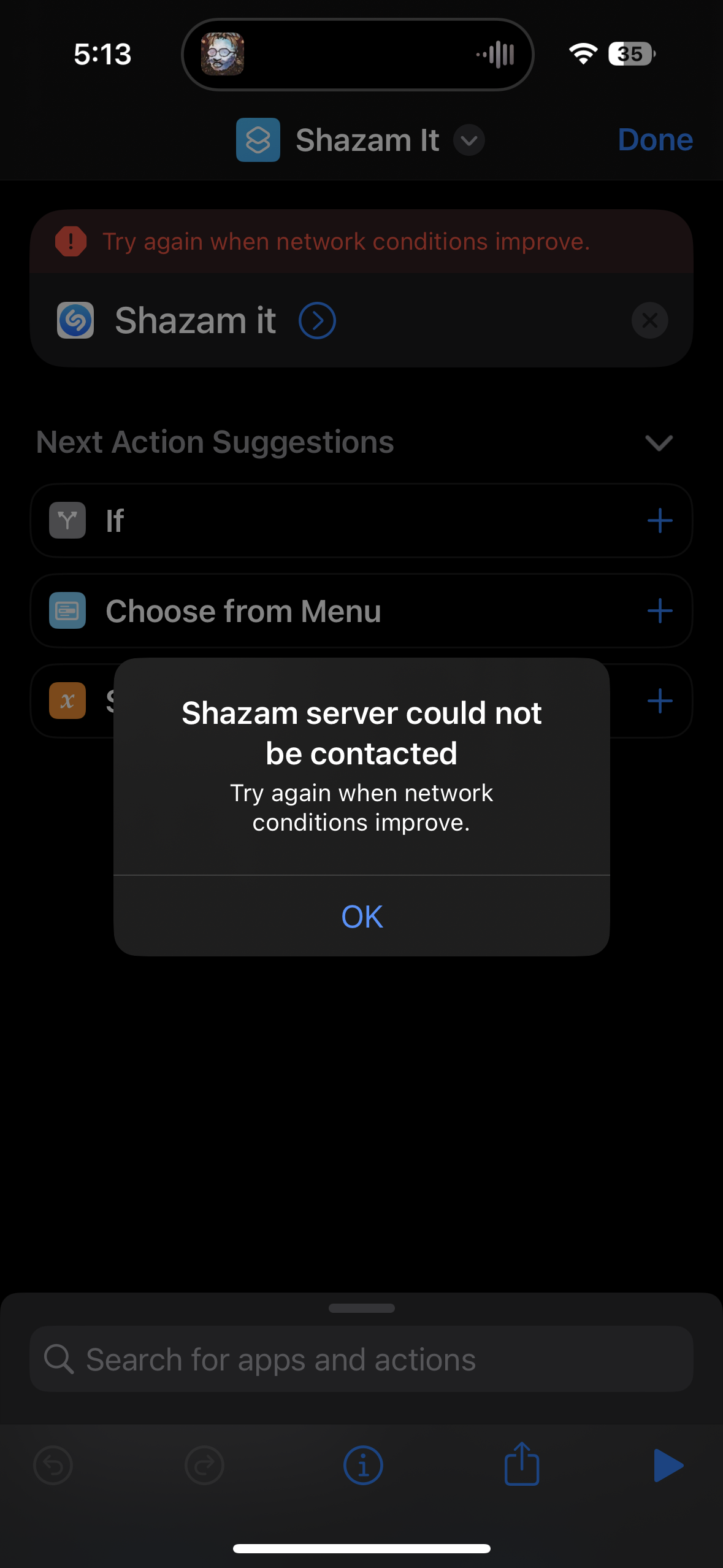 The Shazam it shortcut in Shortcuts app is not working. When run, pops an error. Also Shazam & save shortcut doesn't work as well display's same error popup.