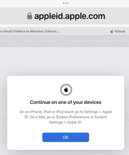 EM seems to need an app specific password, so I went to that screen, typed in the app name and hit 'go'. I've tried this many times without getting any farther. The process just stops once I hit 'generate the password'. Instead I get the message you see here. I can go to the settings pages as requested, but there's nothing there to see.