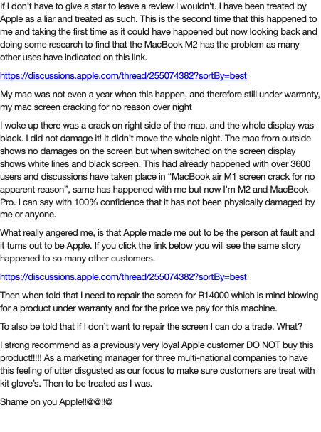 Similar to M1 MacBook Air screen cracking reports during normal use or overnight, without any apparent reason, my MacBook M2 pro screen suffered same. My mac is not even completely one year old, it was working perfectly before I went to sleep last night and when I woke up there was a crack on left side of the mac, after a few hours when I saw it again the crack became bigger and the whole display was black, before it was atleast working half side normally but then it wasn’t at all. I closed it properly, I did not damage it I’m any ways, it didn’t move the whole night. The mac from outside shows no damages on the screen but when switched on the screen display shows white lines and black screen. This had a already happened with over 3600 users and discussions have taken place in “MacBook air M1 screen crack for no apparent reason”, same has happened with me but now I’m M2 and MacBook Pro. The images attached below shows the spread of the crack. I can say with 100% confidence that it has not been physically damaged.