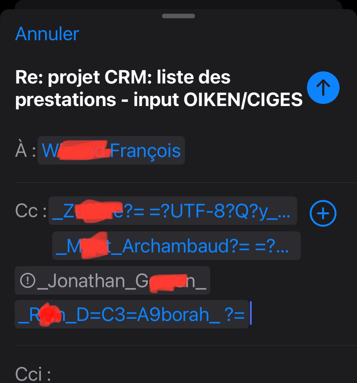 the To or CC headers look messed up because of UTF-8 characters. I see stuff like =?UTF-8?