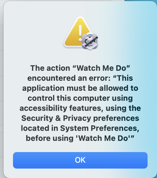 I keep getting the error below, but cannot figure how to add Watch Me Do to Privacy and Security >> Accessibility. I have Automator enabled in Accessibility.