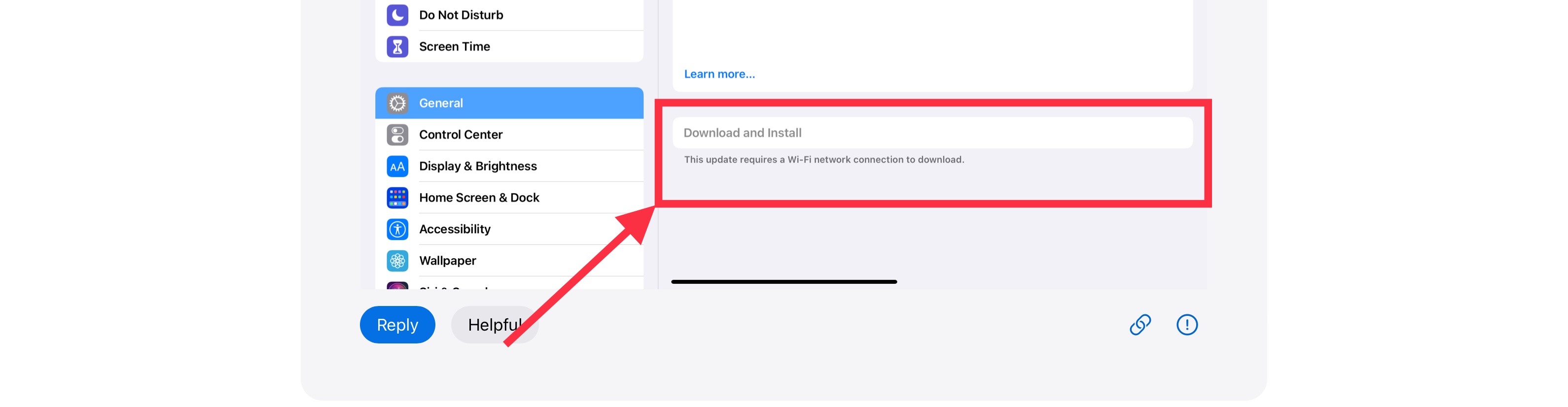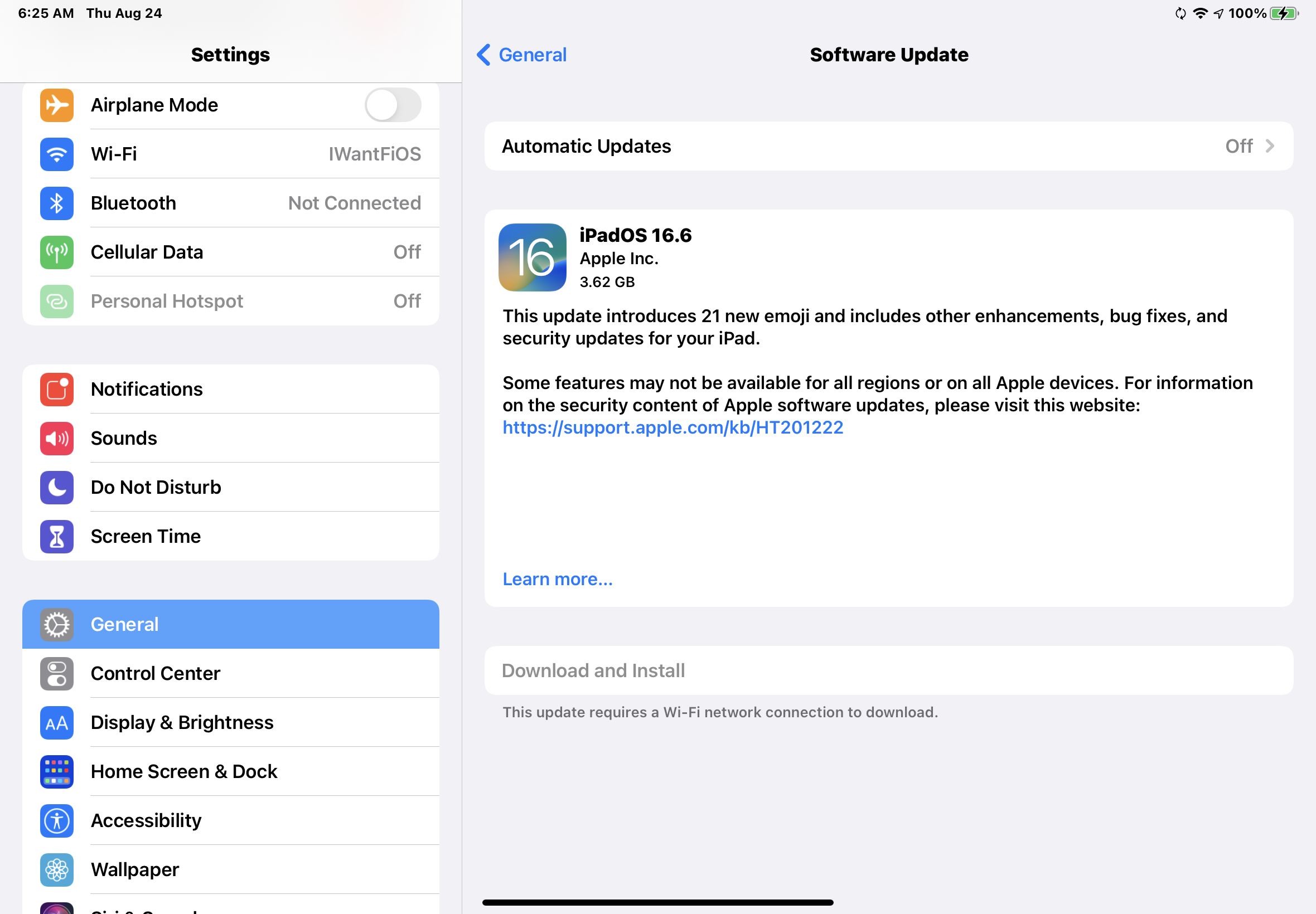 You should note that for your iPad to install an available update, its battery must be charged to at least 50% capacity - and/or be connected to its Power Adapter. Similarly, the iPad can only be updated over a standard WiFi connection - or be updated by a PC or Mac using iTunes or Finder - over a USB connection.