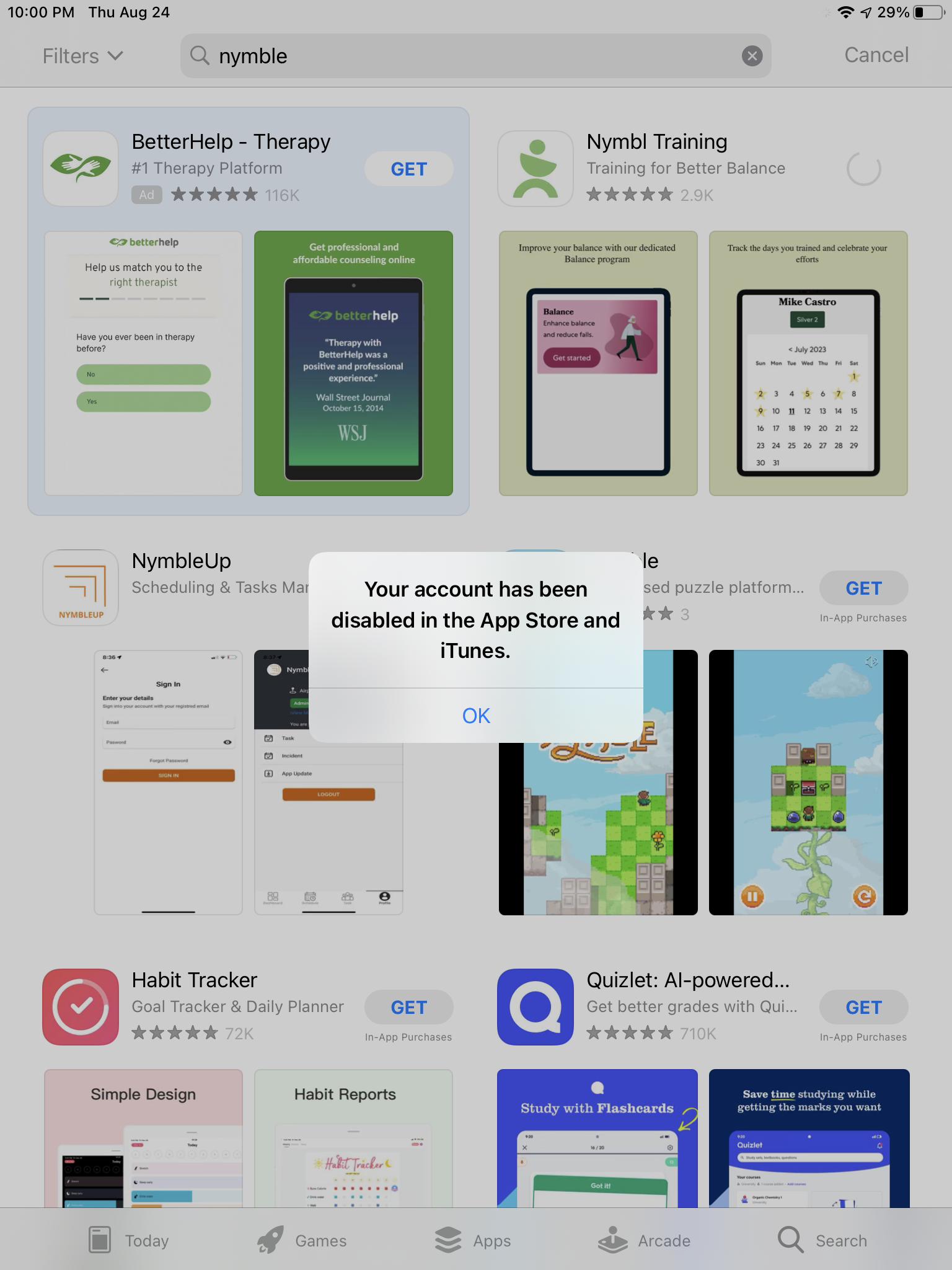 If you see a message that says "Your account has been disabled in the App Store and iTunes", there is a problem with your payment method on your account, to resolve the problem you need help from Apple support, click -> contact Apple Support for help.