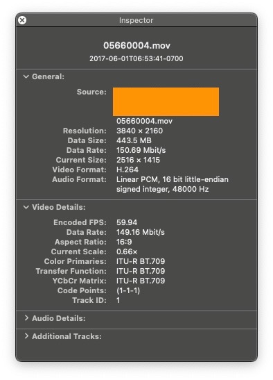 I'm looking to see the color bit depth of clips that I am working in are 8-bit or 10-bit. If the file is recorded in HEVC the QuickTime "Info" panel shows the bit rate (first attachment), but some other formats do not show a bit depth in the "info" panel (second attachment).