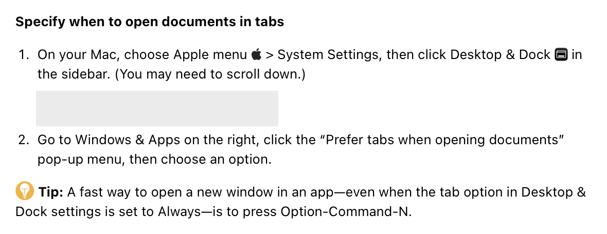Suddenly practically everything I do that used to create a new window now just adds a tab if there's already a window open. I've most noticed this in Mail and Quicken, but I think it happens in other apps as well. It does not happen in the Finder. This behavior might have started with the installation of Ventura; I'm not sure. Neither Mail nor Quicken has relevant settings I can change, and the Finder setting for "Open folders in tabs instead of new windows" is not checked. I find this behavior very inconvenient, because I frequently close a window when I'm done with it, only to realize that this action closed another tab on the same window that I was NOT done with. Any idea how to revert to the old way?