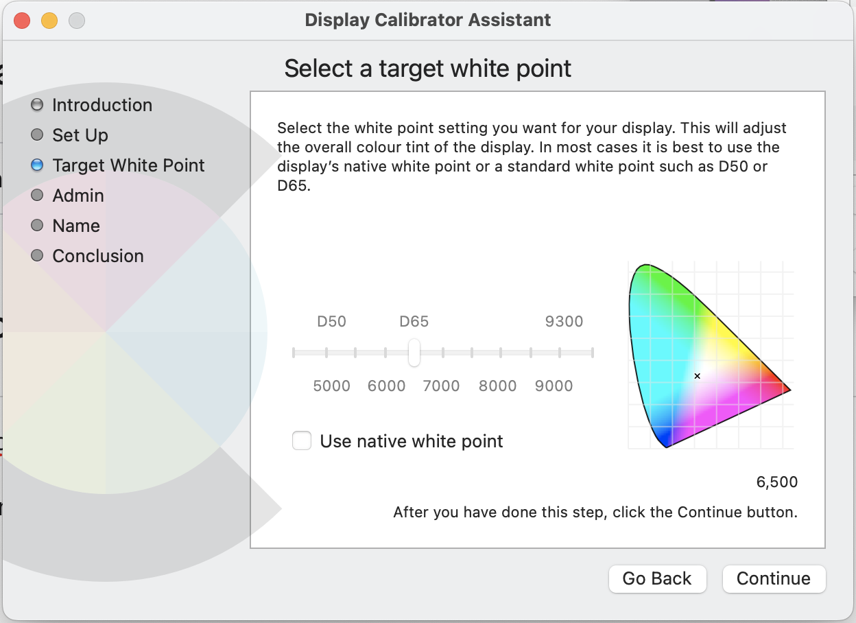 While I am trying to Calibrate the display through Display Calibrator Assistant in the wizard after "Introduction" it is skipping the "Set up" and directly going to "Target White Point". I have attached the screenshot of the problem.