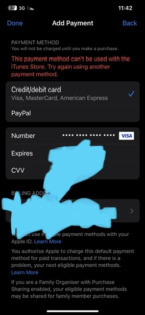 This payment method can't be used with the ¡Tunes Store. Try again using another payment method.