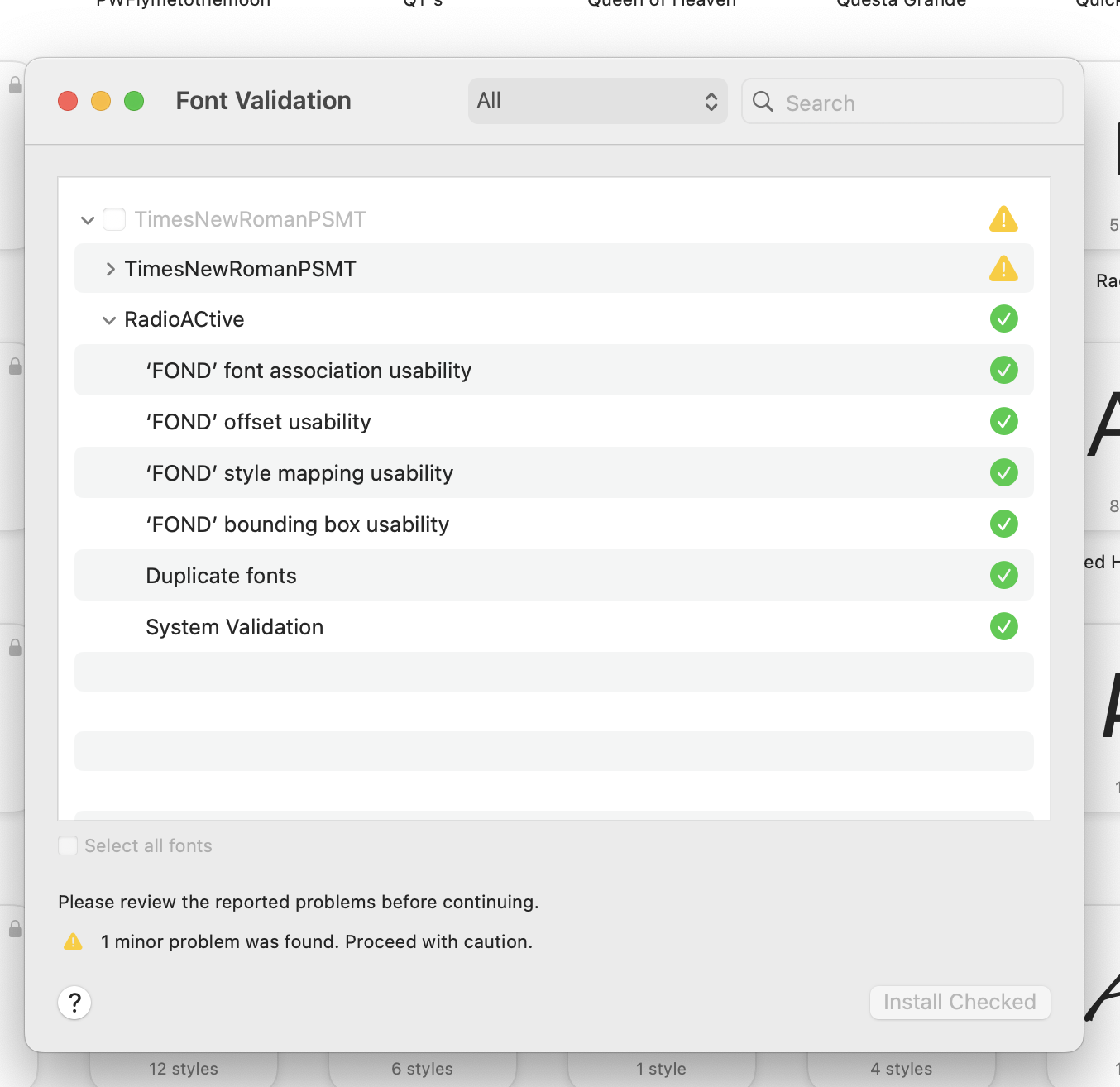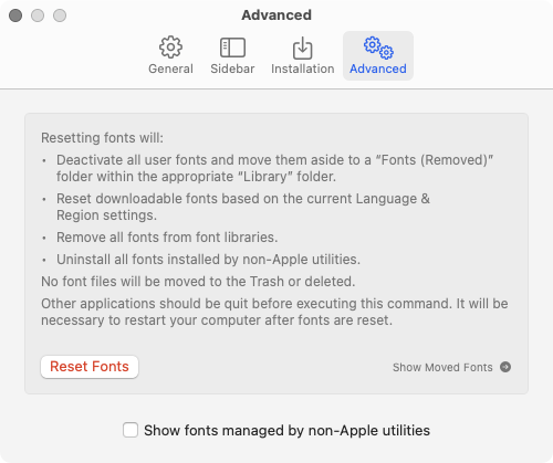 Clicking this will move all of your third party fonts out of your user account Fonts folder into a new folder right next to it named, Fonts (Removed). It will do the same to the Fonts subfolder in the root Library folder.