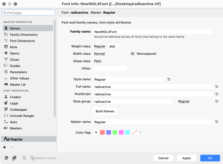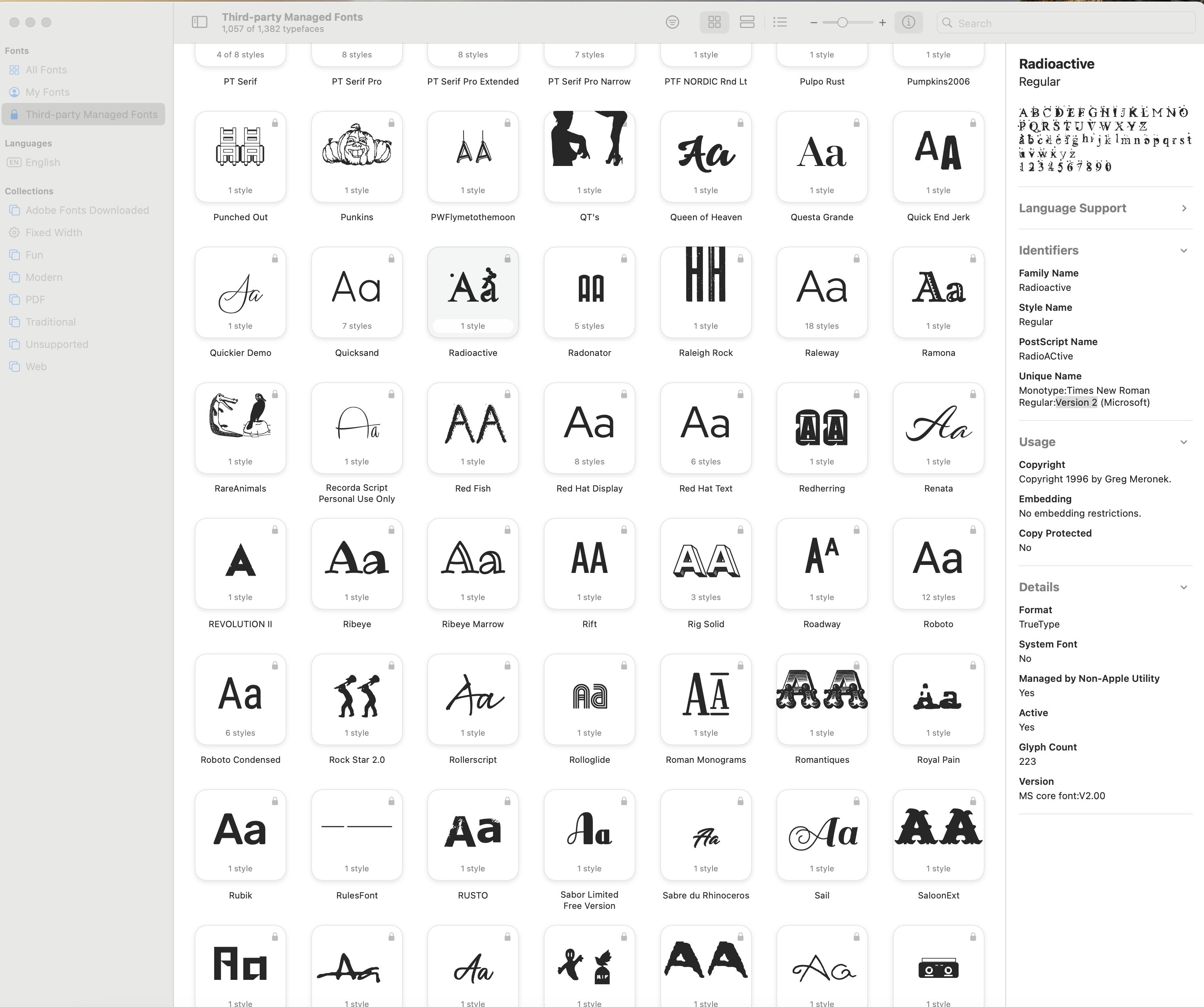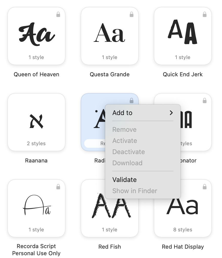 With the Library folder now visible in your user account, open that, and then the Fonts folder. Locate the Radioactive font and put it in the trash. Restart the Mac, and then empty the trash.