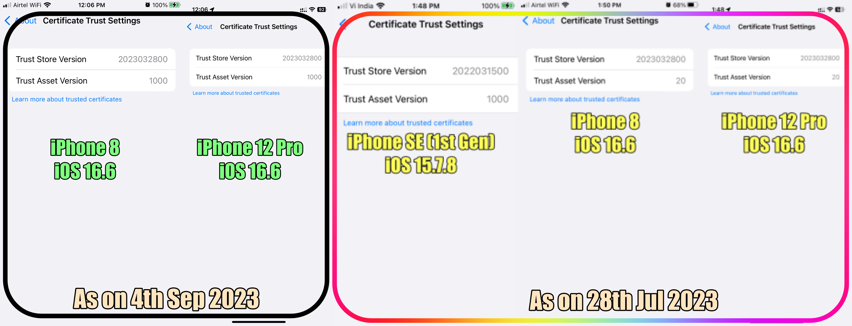 Earlier, iPhone 8, SE (1st Gen), iPhone 12 Pro & iPhone 13 Pro on iOS 15.6.1 also iPad Pro on iPadOS 15.6.1 all are with Trust Store Version: 2022031500 and Trust Asset Version 17