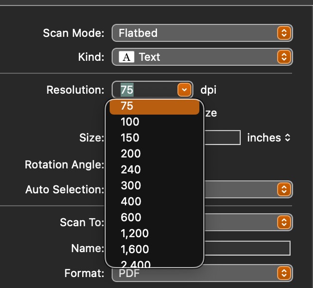 I know I've used Image Capture to scan at 72 dpi before. My scanner was broken for a while, I recently got a new one (two new ones actually; a Brother and an Epson—my old one was an Epson as well.) I fired up Image Capture, it starts just fine, recognises both scanners, but the only dpi options it's offering are 100/200/300/600. What happened to 72 dpi? I tried typing it into the box, but it won't accept it. Tried every tweak within the program that I could think of, and googled without much success. Is there a way I can set Image Capture to scan at 72 dpi?