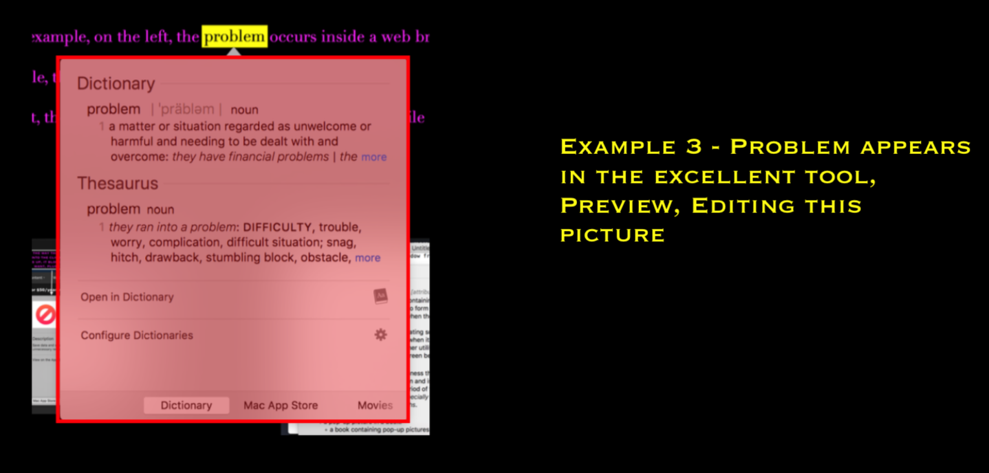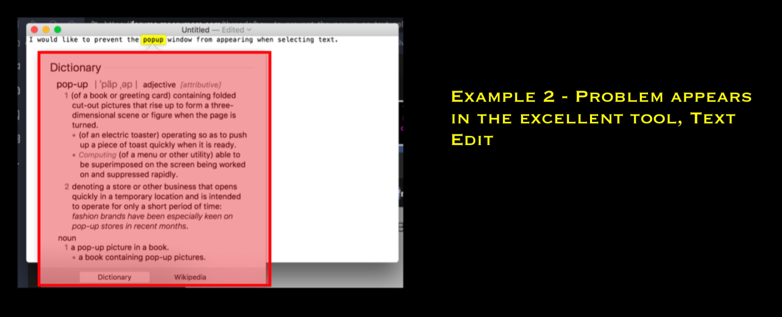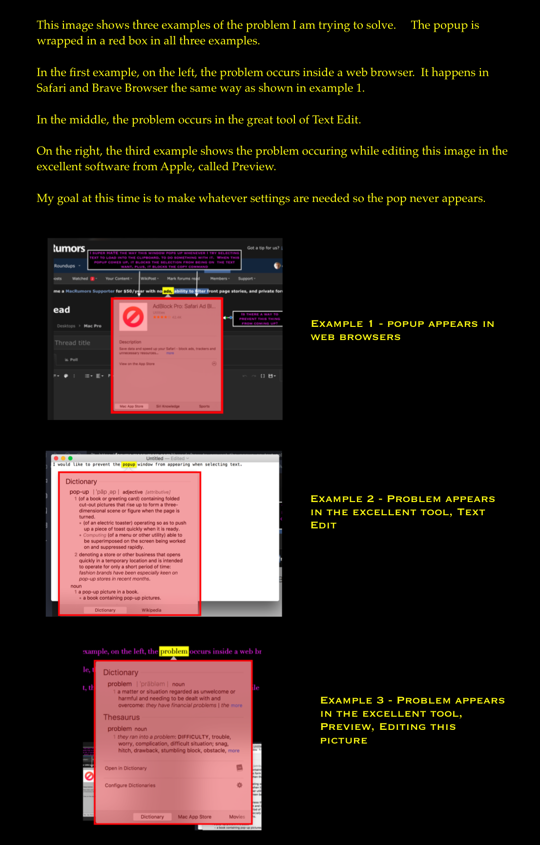 I am deeply troubled by a complicated problem I can hardly explain. When attempting to select text on my Macintosh computer, a popup appears that blocks which text is selected and prevents the selected text from being saved to the clipboard. Is there a way to change settings somewhere to put an end to this problem?