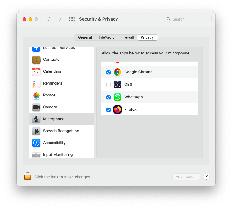 Even in the system preferences i did setting check the app listed , the microphone is not working, only in Safari.