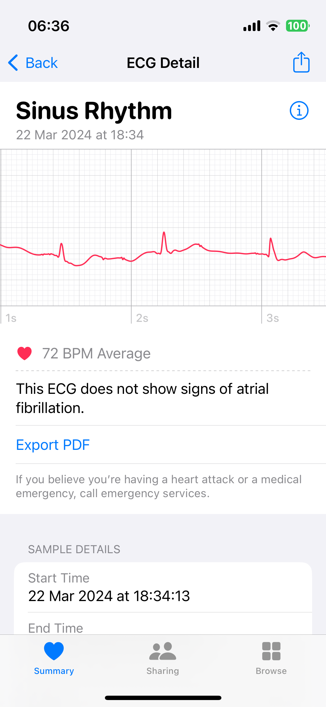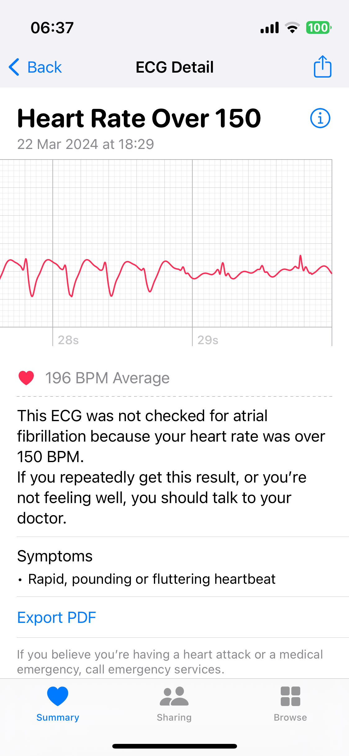 It’s not the best recording, and the watch does say something about the HR being over 150 and so the accuracy was lessened, but it still showed a significant difference between resting and SVT ECG recordings.
