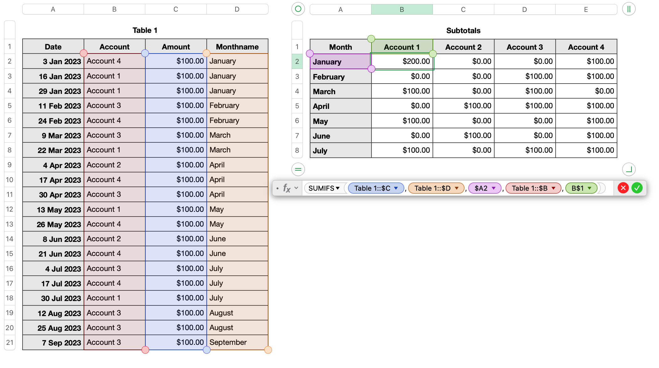 In Subtotals, Column A is month name as Text. (That stops Numbers automatically inserting the year. If you want to sum per month over different years, we can do that).