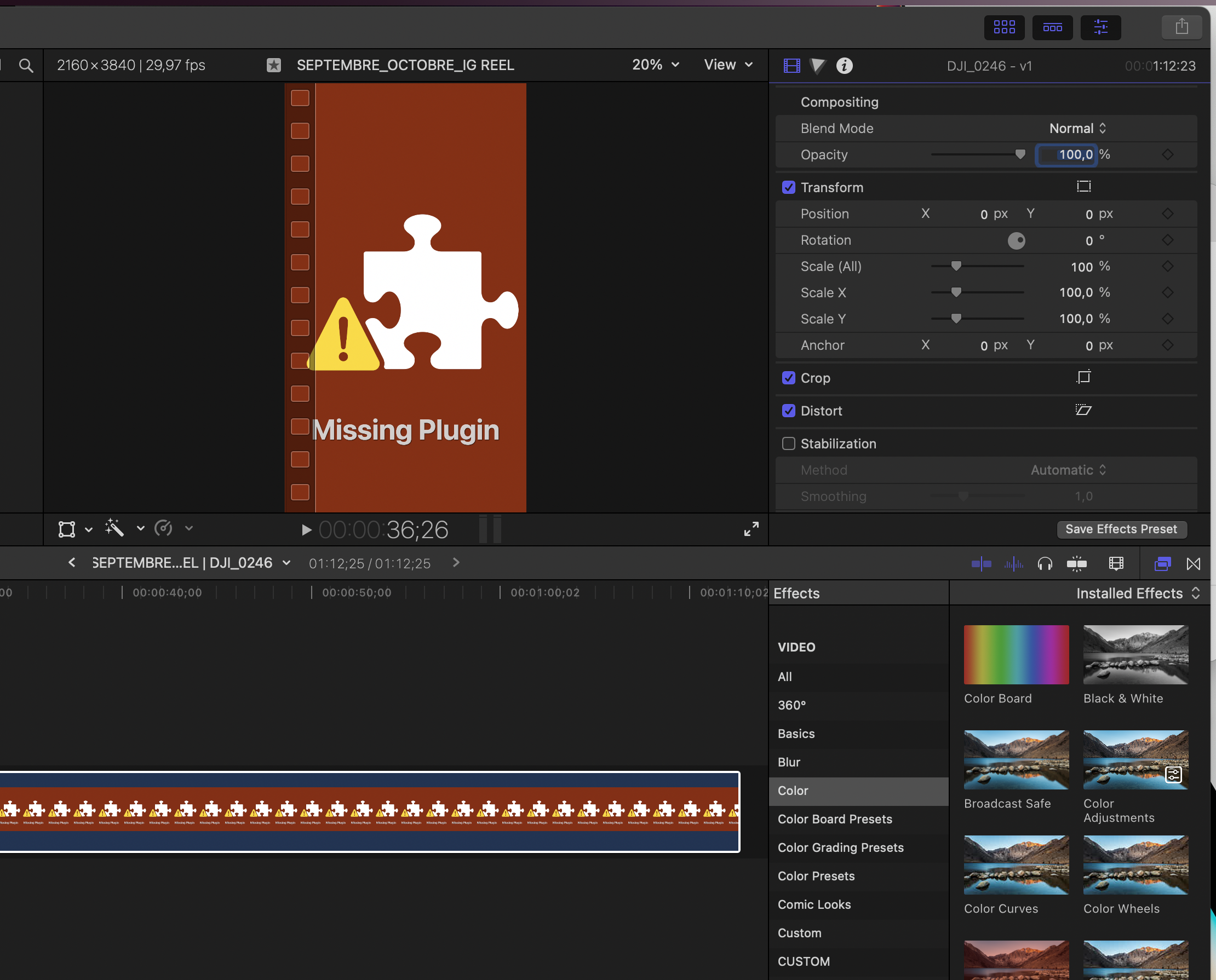 Hello Luis! They are all the same format yes. Vertical footage 25fps shot 2mn apart. I didn't change anything. What is weird is that Final Cut Pro copy the file in my Final Cut Pro Optimised media file and it looks fine but in my final cut pro timeline I have got an error message "Missing plugin". What does that mean if I don't even use any plugin?