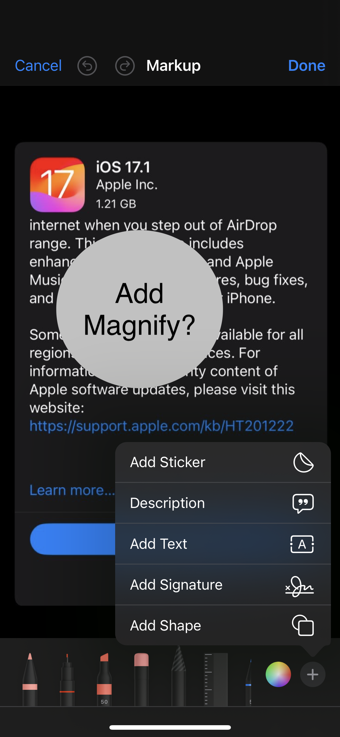 I updated my iphone to ios 17 and then I needed to edit a photo with markup. That's when I noticed the magnify option is missing. What can I do to get it back.