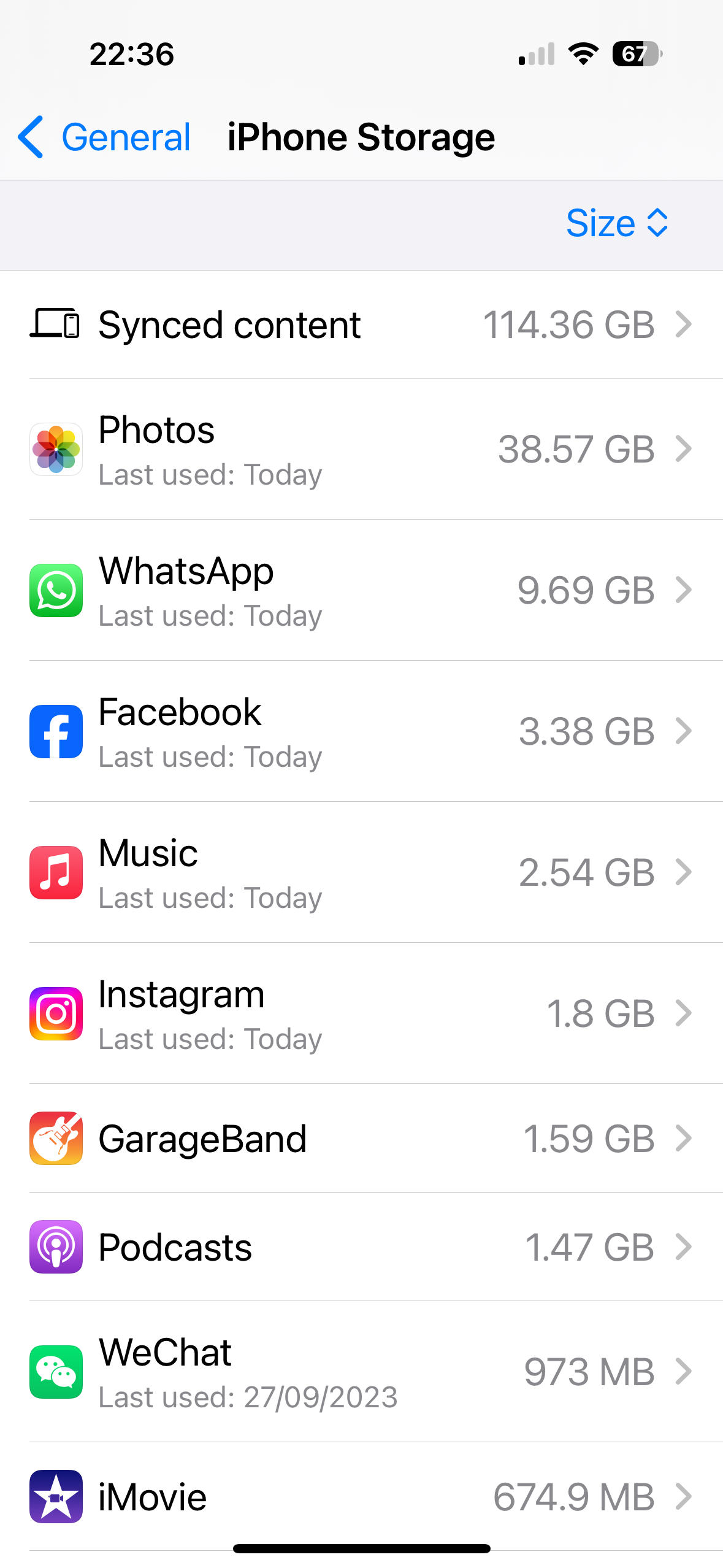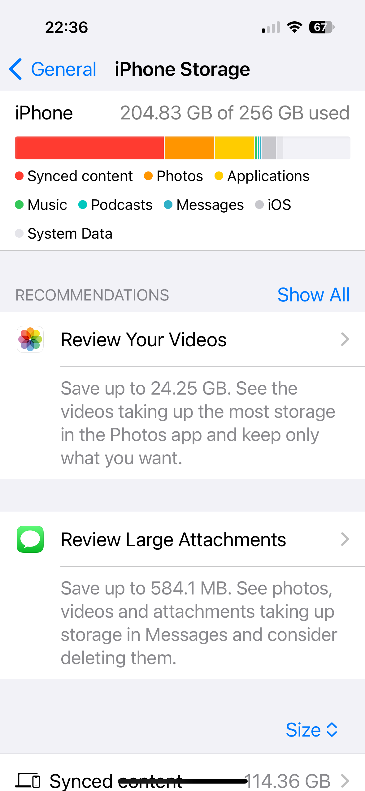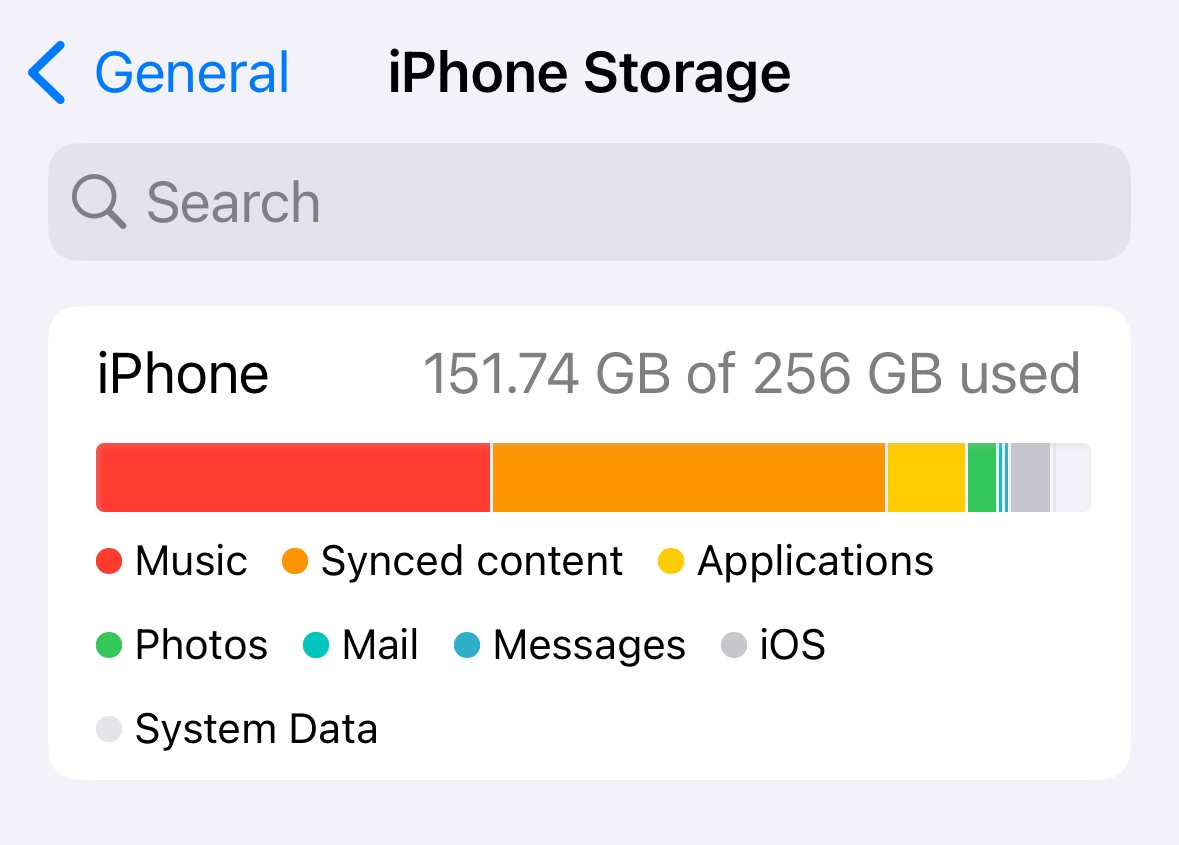 I get conflicting information on my phone about this. In iPhone storage it says that I currently have used 152 GB of my 256 GB storage (although the image of usage doesn’t reflect this - indicating that my phone is almost full), yet when I scroll down to application Size, I can see Music taking up 102.9 GB & Synched content also supposedly taking up 102.5 GB: