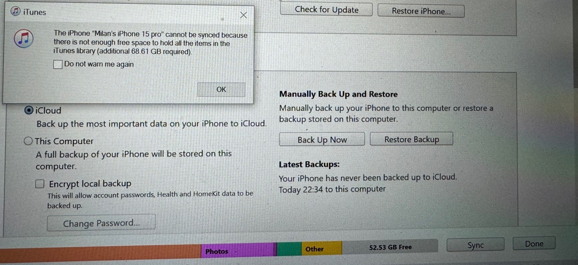 Then I connected phone to pc and opened itunes. It backed up OK but when it was about to sync music I got the same error message saying not enough storage.