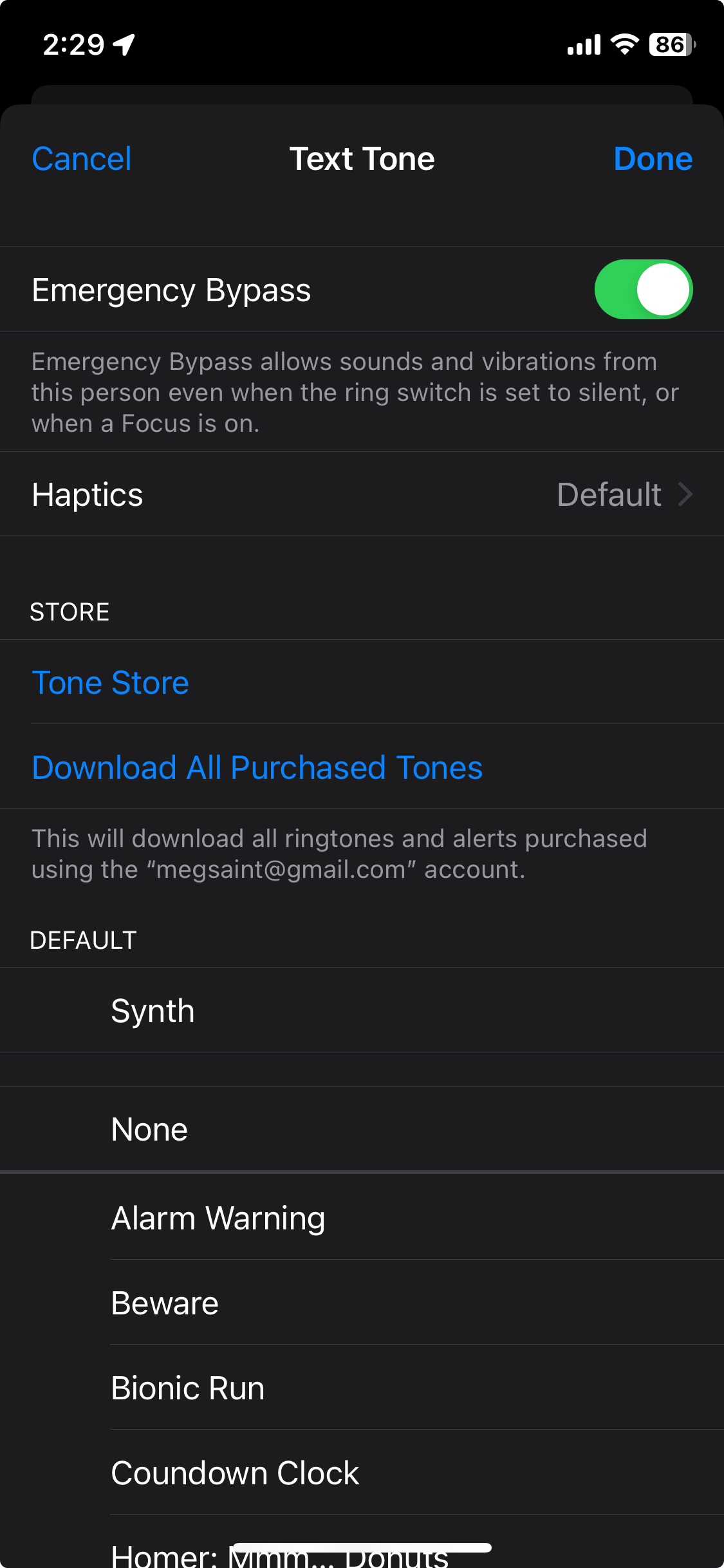 How do I change my iOS email notification to my iTunes ringtone that I paid for? I had it selected then I changed it by accident, and now it will not allow me to choose from my paid for iTunes ringtones?