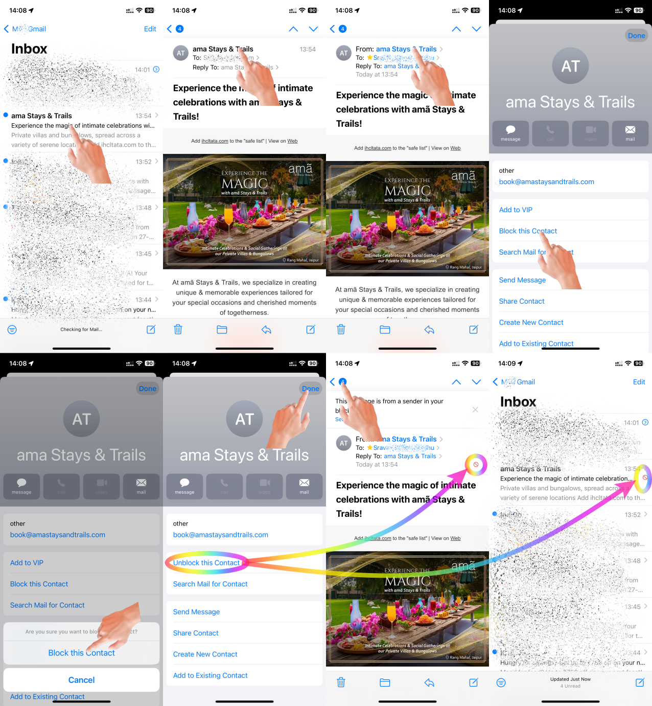 I figured it out . When you select your name on the email in question it brings up your phone file. Scroll down and now you will see the option to unblock the email. Once this is done the red circle will disappear.