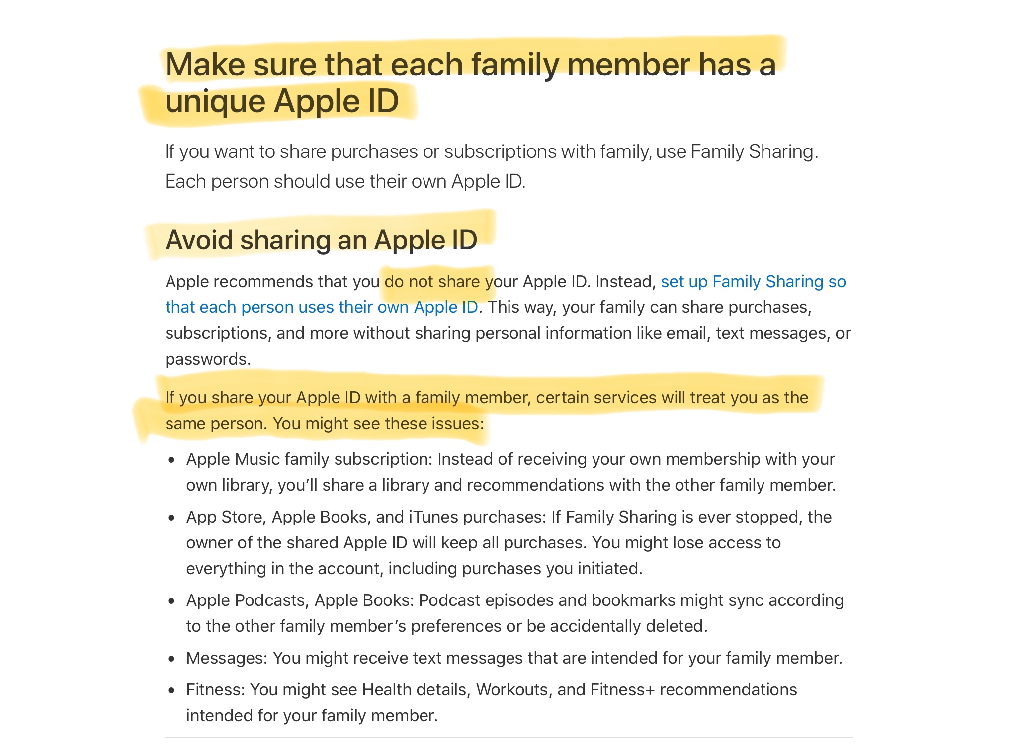 Apple recommends not sharing an Apple ID, because, well, stuff is shared: