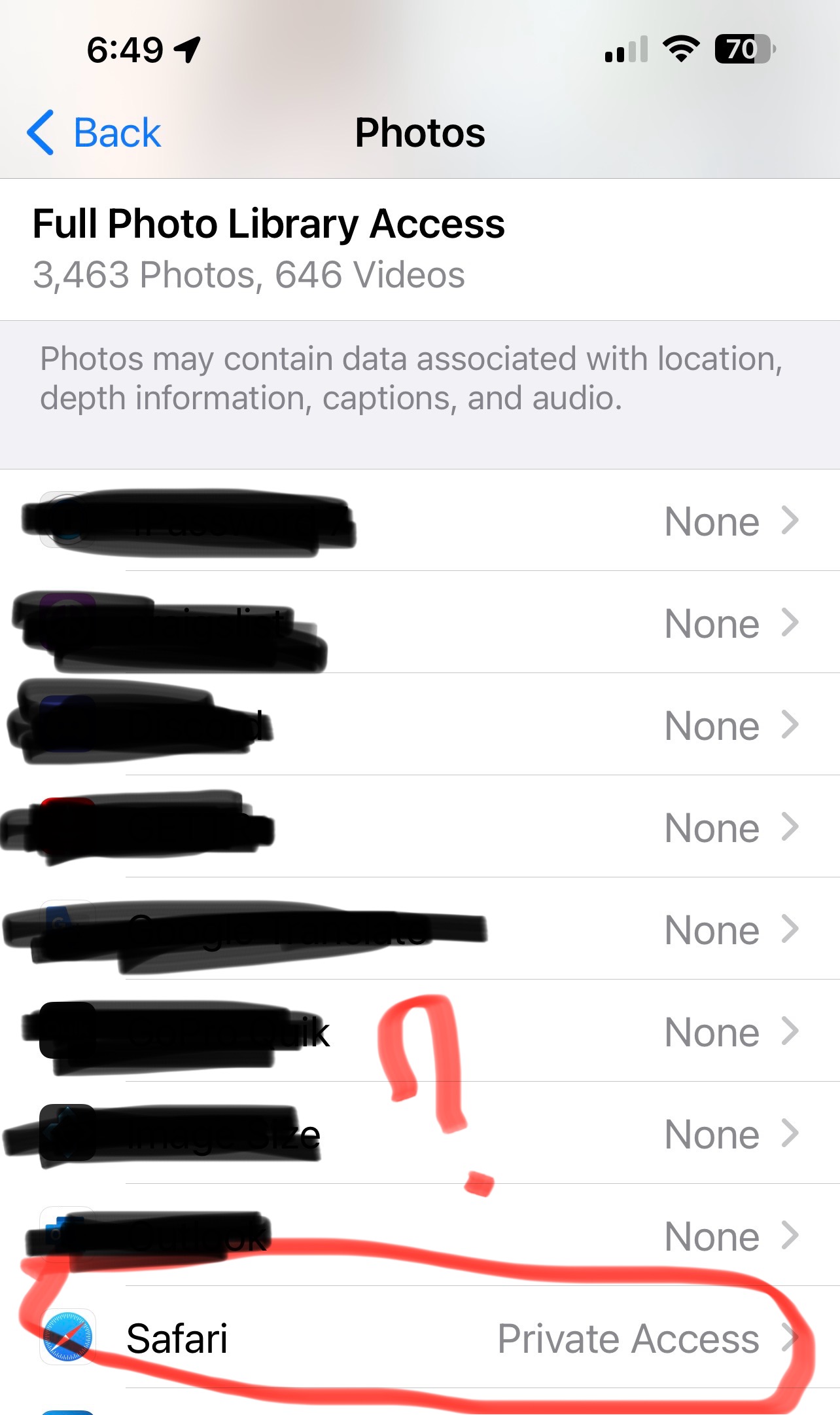 This is by the way not new and exactly the way photo selection for certain apps like Browsers worked before (I assume since iOS 14). With iOS 17 only the presentation and wording of this function changed. Up to iOS 16 “Limited Access” showed as “Selected Photos” and Apps like Safari would be listed separately under the heading “Apps with One-Off Photo Selection”, see screenshot.