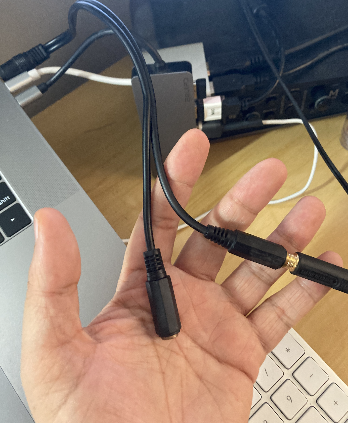 I bought a headphone splitter for my macbook - just a standard 1/4 inch short cable to two 1/4-inch inputs so I can use two sets of headphones with GarageBand and Logic.