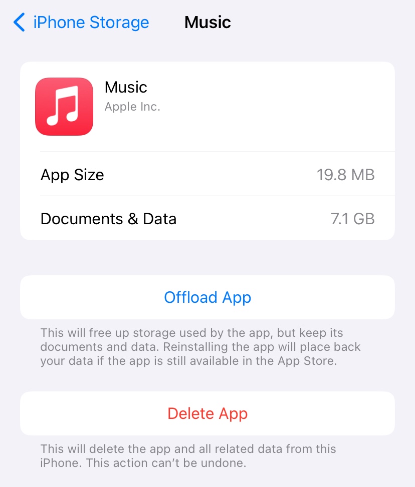 I have no songs or videos downloaded. I have tried offloading and deleting the app, but I still have 7(!!!) gigs of data that won’t erase.