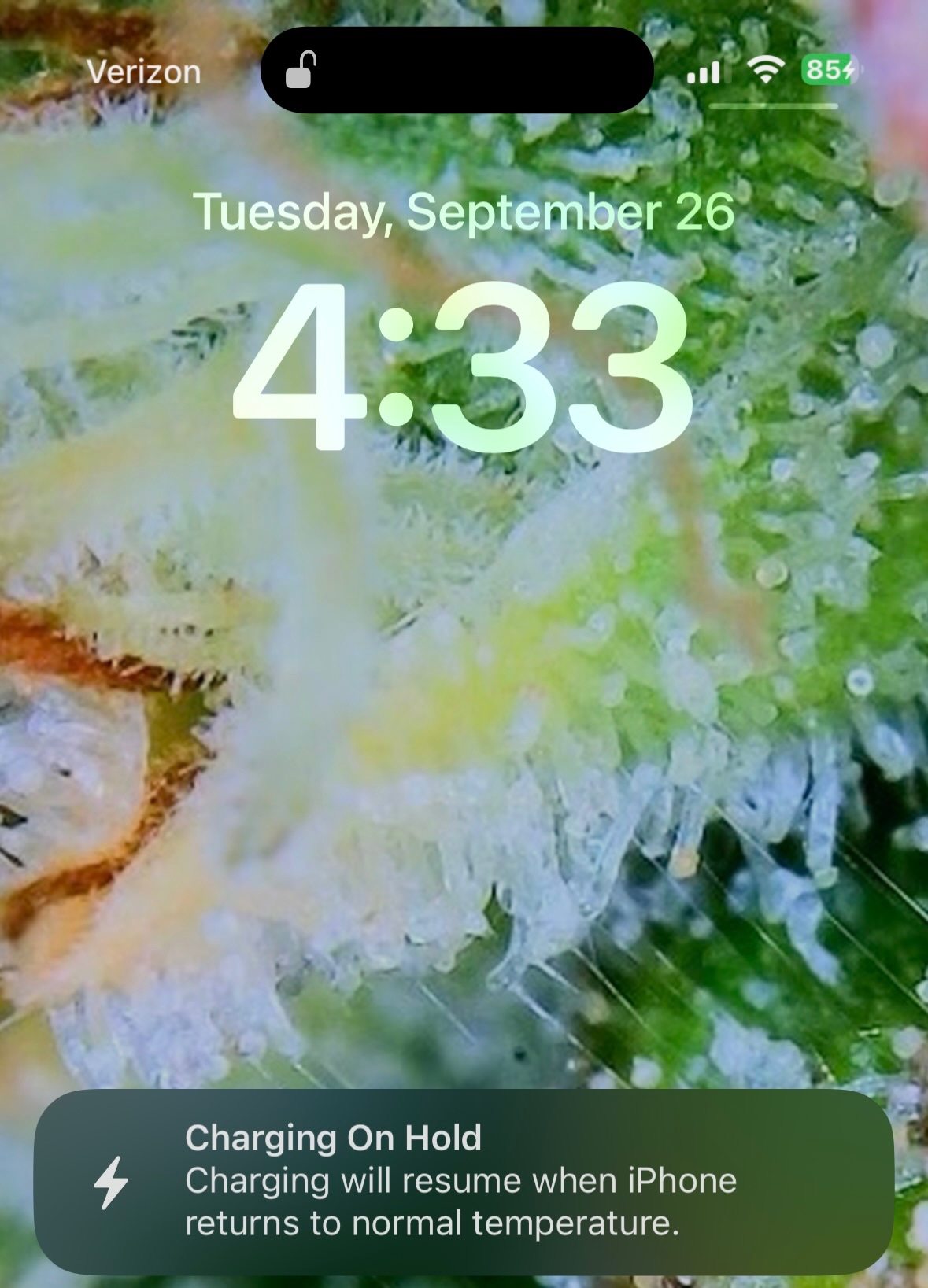 Today, when I picked up the phone from my desk after not using it for some time, I noticed that it felt warmer to the touch. This seemed a bit odd, but I didn't think too much about it at the time. Not long afterward, I realized that my battery was draining faster than usual. Now, I believe this may be due to whatever is causing the heat issue. Shortly after plugging the phone in to charge, I saw the 'Charging On Hold' message.
