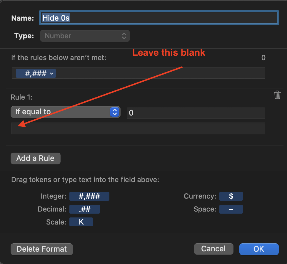 If the sum of an argument is zero, I want to see an empty field, not the number zero. Any suggestions?