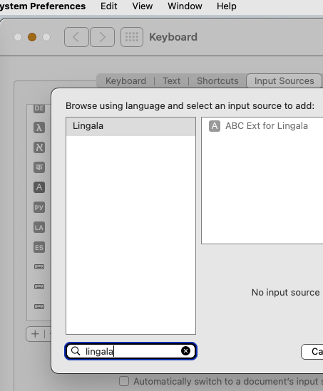 Then go to system preferences > keyboard > input sources and use the + button to find Lingala and add ABC Ext for Lingala to your list, and then select it in the Input Menu at the top right corner of the screen. Use Keyboard Viewer to see which key does what. Let me know if any problems.