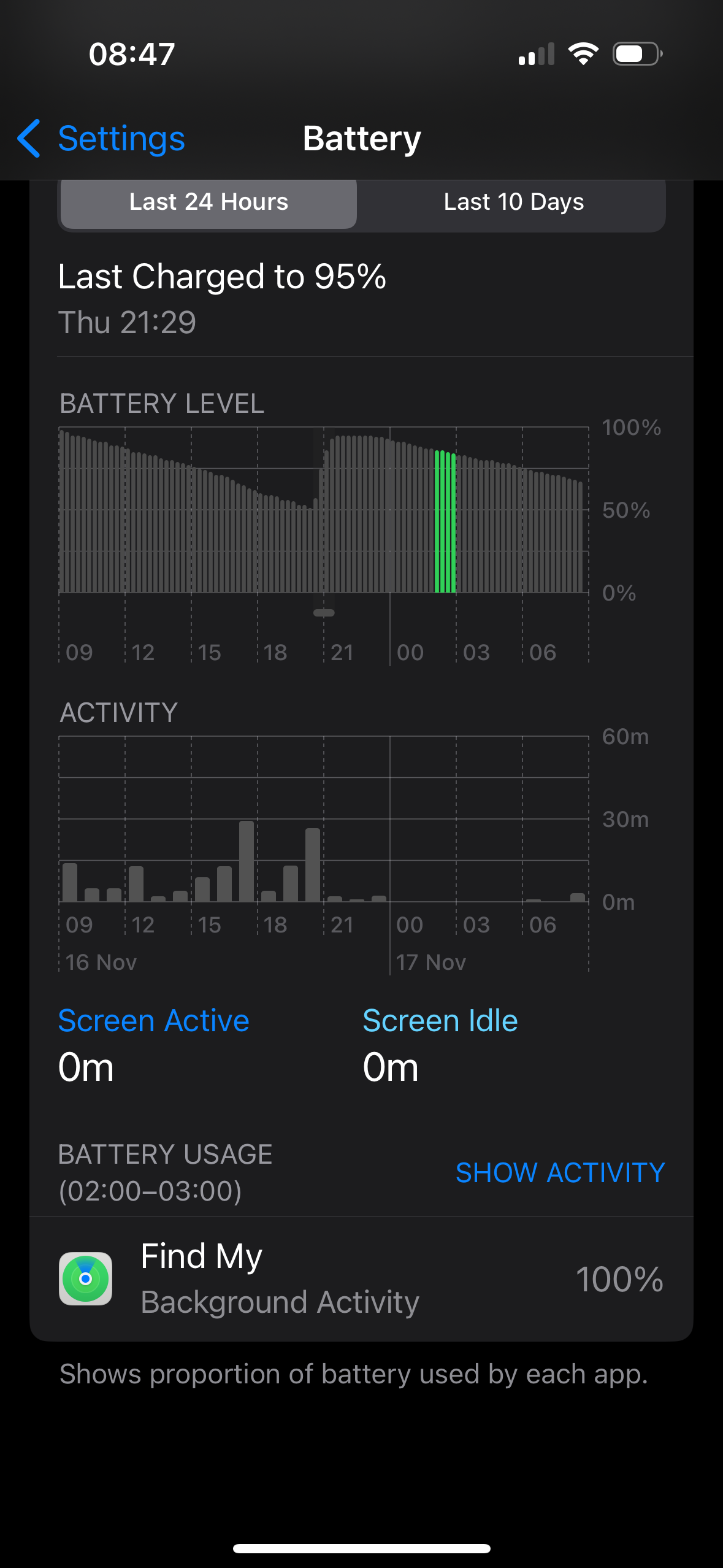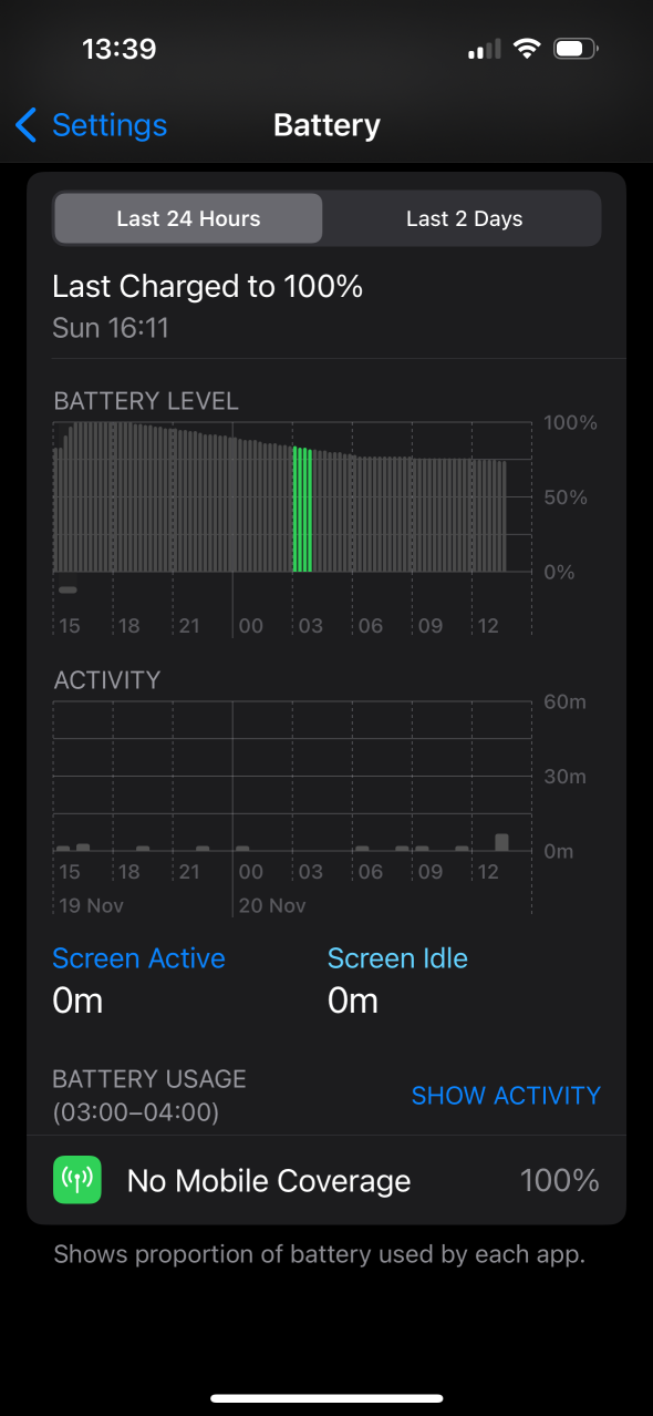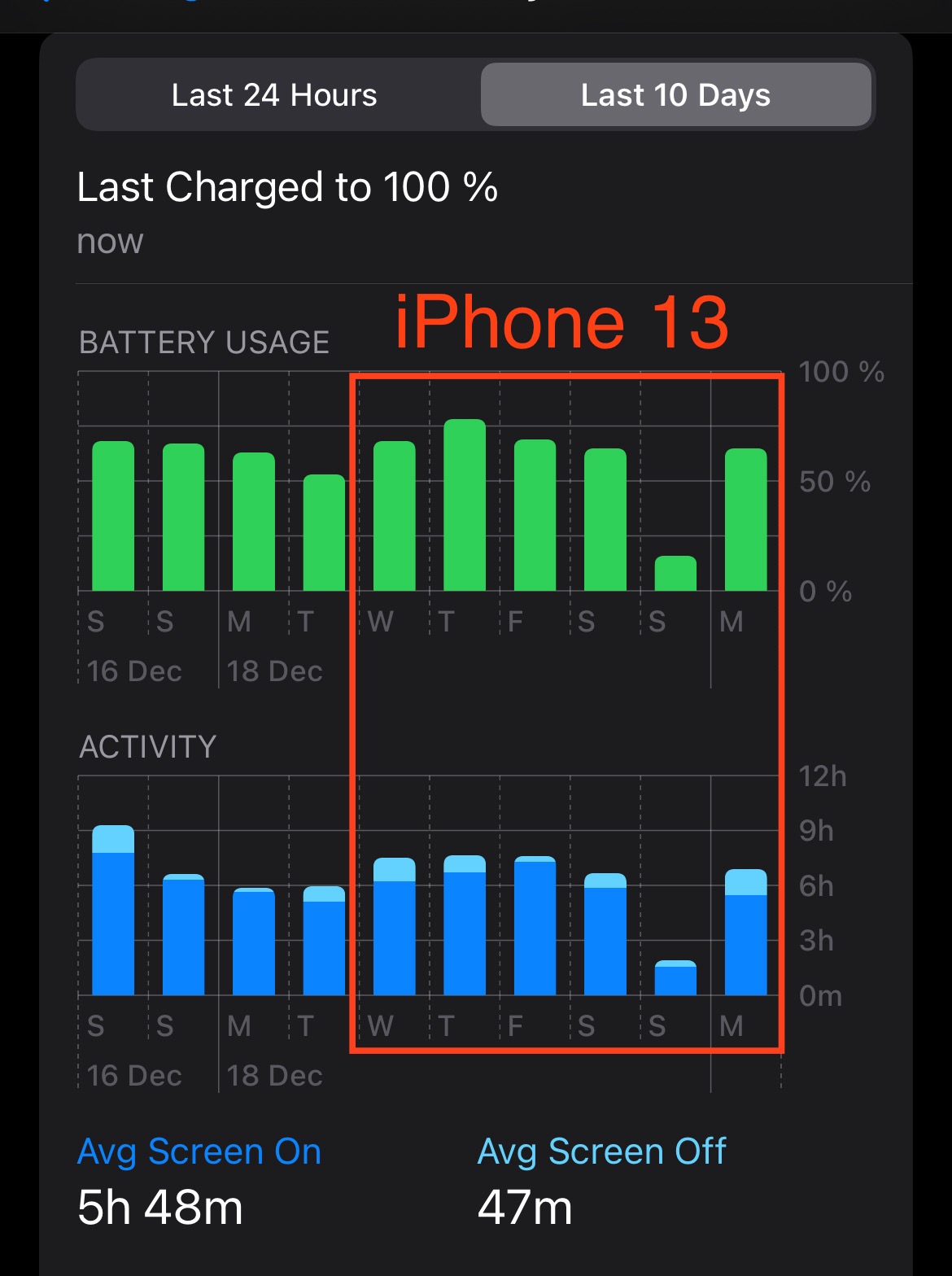 Picture 2 (iPhone 13): Compare the battery usage of the iPhone 13 to the usage of iPhone 15 Pro and you will see it performs a lot better. But also here after updating 17.2.1 the performance has been impacted negatively, but not as radical as on the 15 Pro.