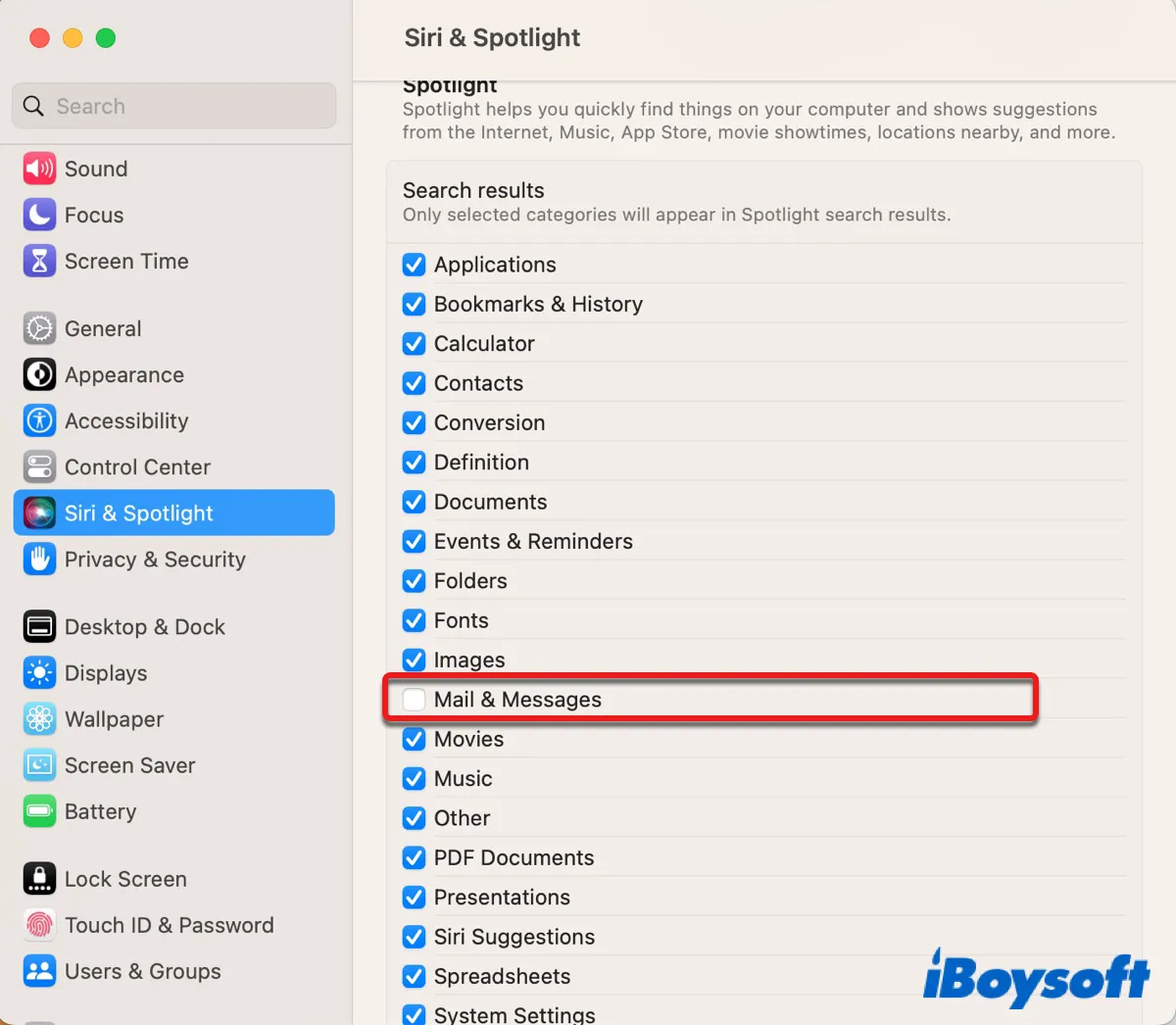 • Mail may be excluded from Spotlight searching. To check, choose Apple menu  > System Settings, then click Siri & Spotlight  in the sidebar (you may need to scroll down). Go to Search Results on the right, then select the Mail & Messages checkbox, if not already selected.